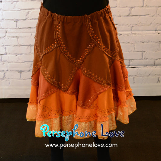 Brown orange ombre patchwork denim upcycled twirly spiral festival skirt embroidery sequins-2006