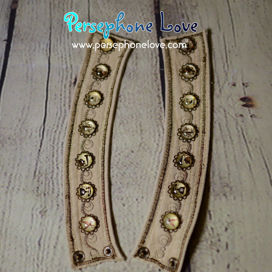 TWO brown gold embroidered beaded rhinestone lace steampunk upcycled denim bracelets-1186
