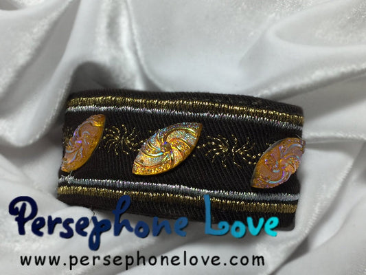 Brown gold metallic embroidered steampunk upcycled denim bracelet-1136