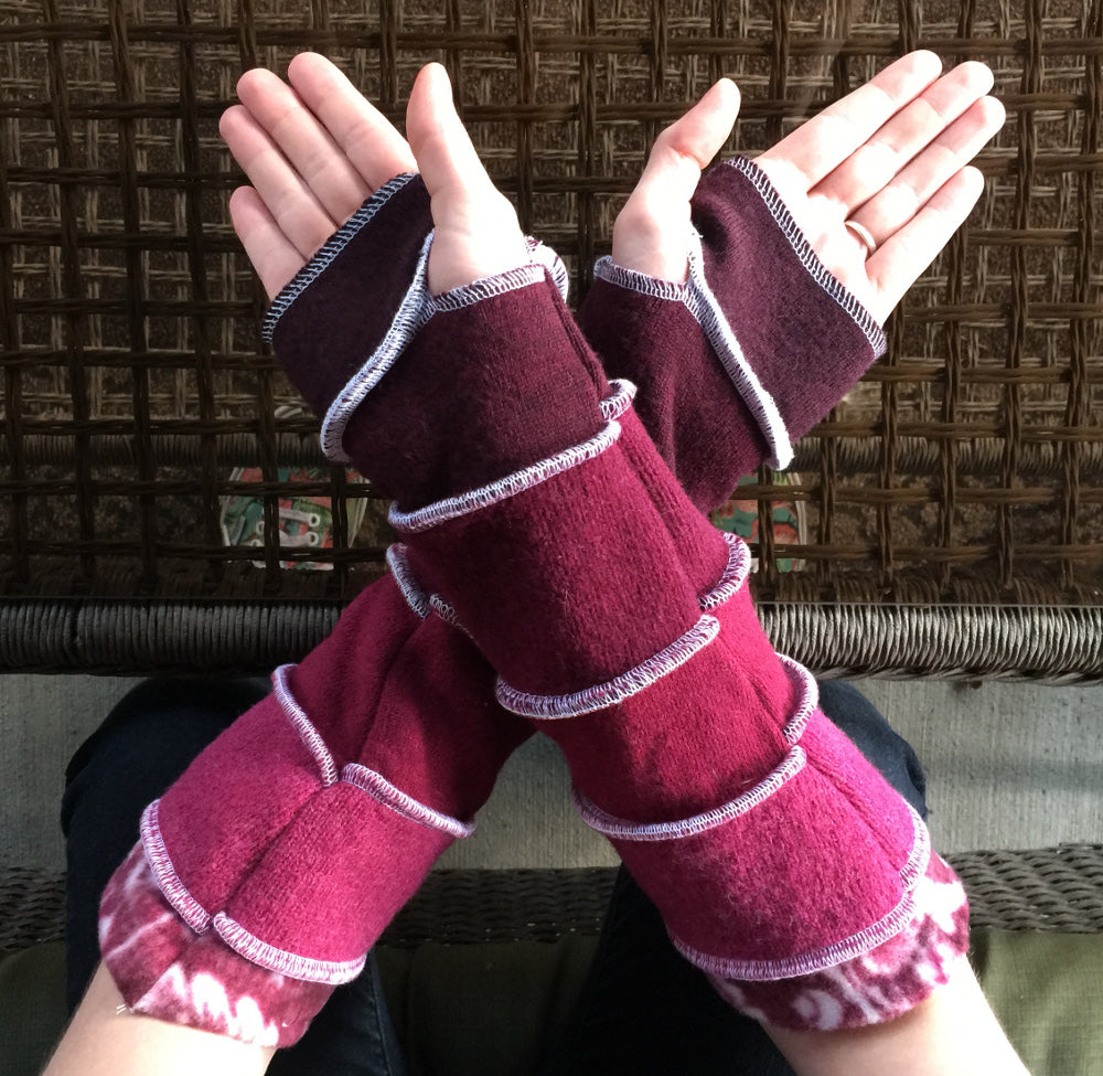 Needle-felted upcycled merino wool/cashmere arm warmers with thumb holes. Some of these have fleece for added softness and visual flare. The machine-needle-felting process makes these twice as thick and super warm. It also takes a lot longer to make these than other Katwise-style arm-warmers you may have seen, which is why they cost what they do (that plus cashmere is just a more expensive material and double-thickness is double-materials-cost). One size fits most and they are thick enough not to "droop" on you but still buttery soft and luxuriously comfortable. Sized generally for smaller adult bone structure but not intending to exclude anyone. I just want them to fit. They are impossible to perfectly measure, but I've done my best to give you some rough measurements to help out. đ