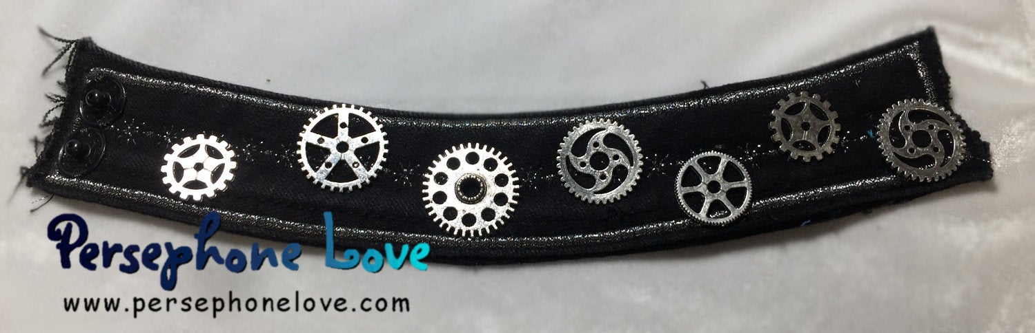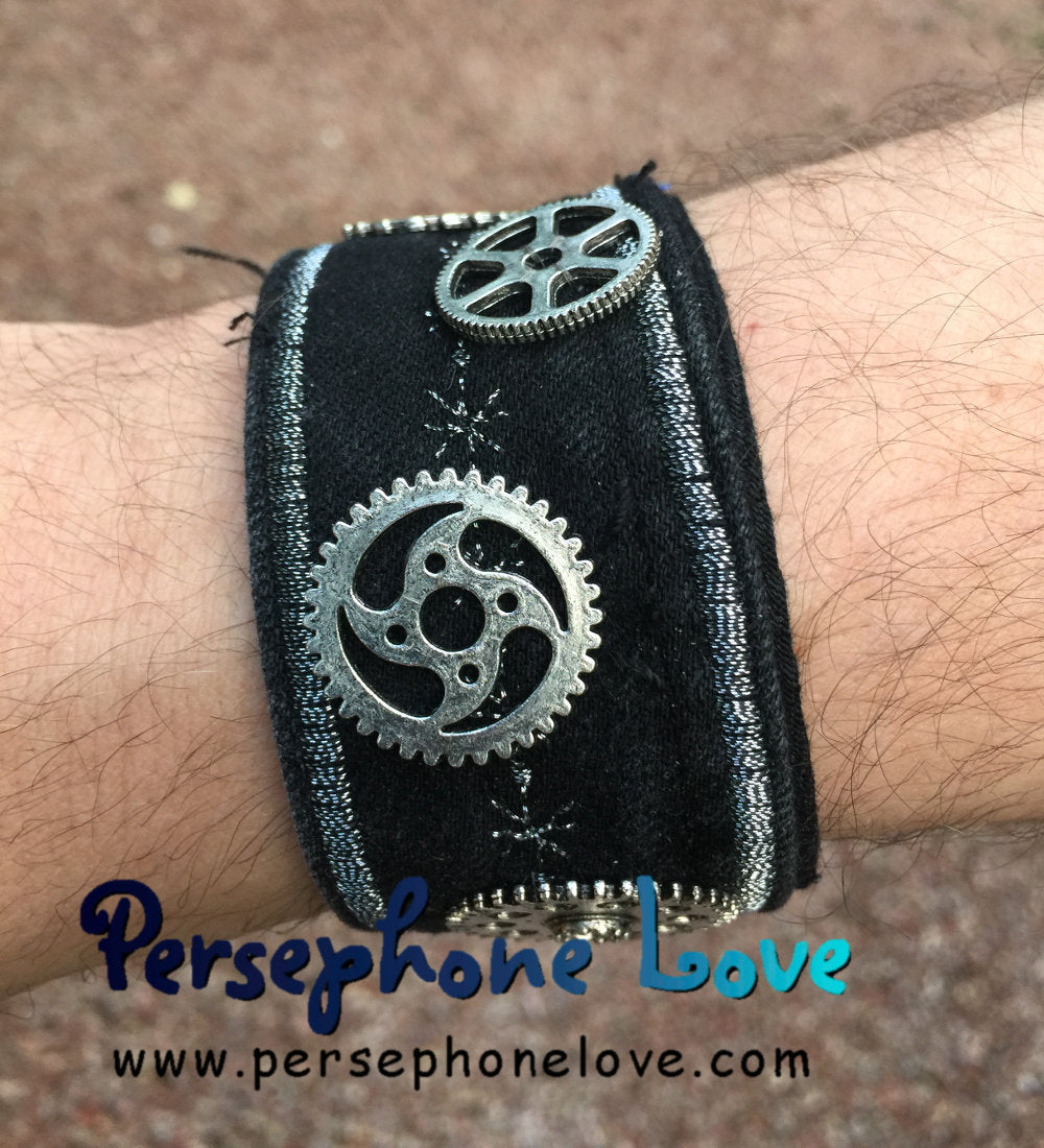 Is it gothic? Is it steampunk? Is it industrial? I think this one is all of the above... reminds me of punk/biker style as well. This sleek black and silver gothic-looking bracelet is made from the waistband of denim jeans. Dark silver embroidery graces the outer edge. Silver steampunk gears have been attached all around using invisible thread and the bracelet fastens with two large snaps. This is one of my larger bracelets, which will fit a small to medium build man nicely, or will be loose on a woman, depending on your wrist/arm size. It is truly a labor of love. From cutting up the denim, to embroidery, to hand sewing (invisible thread is a pain to sew with but yields better looking items!), to photograph and listing, this takes about two hours to make.  These are NOT adjustable - need a different size? Check my other items as I tend to vary the sizes and designs, so each bracelet is slightly different and no two are alike.