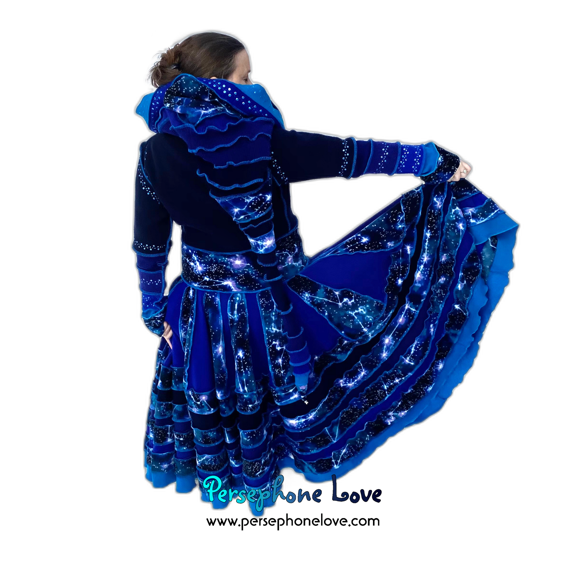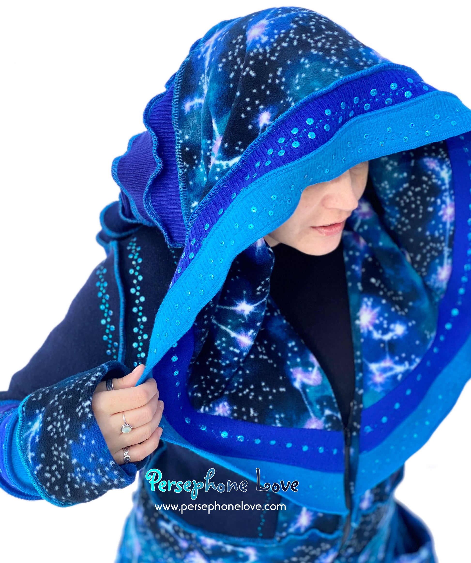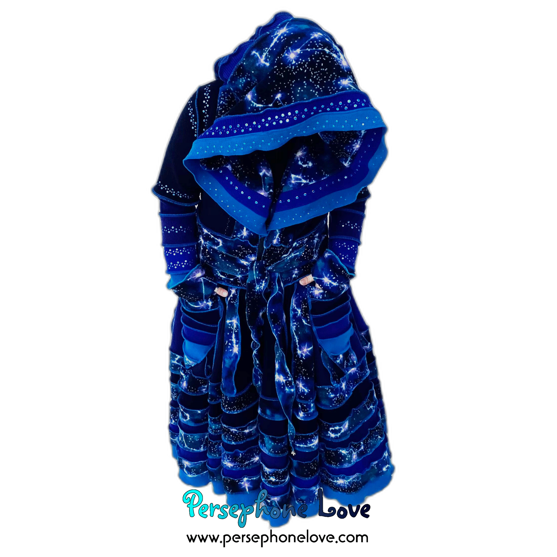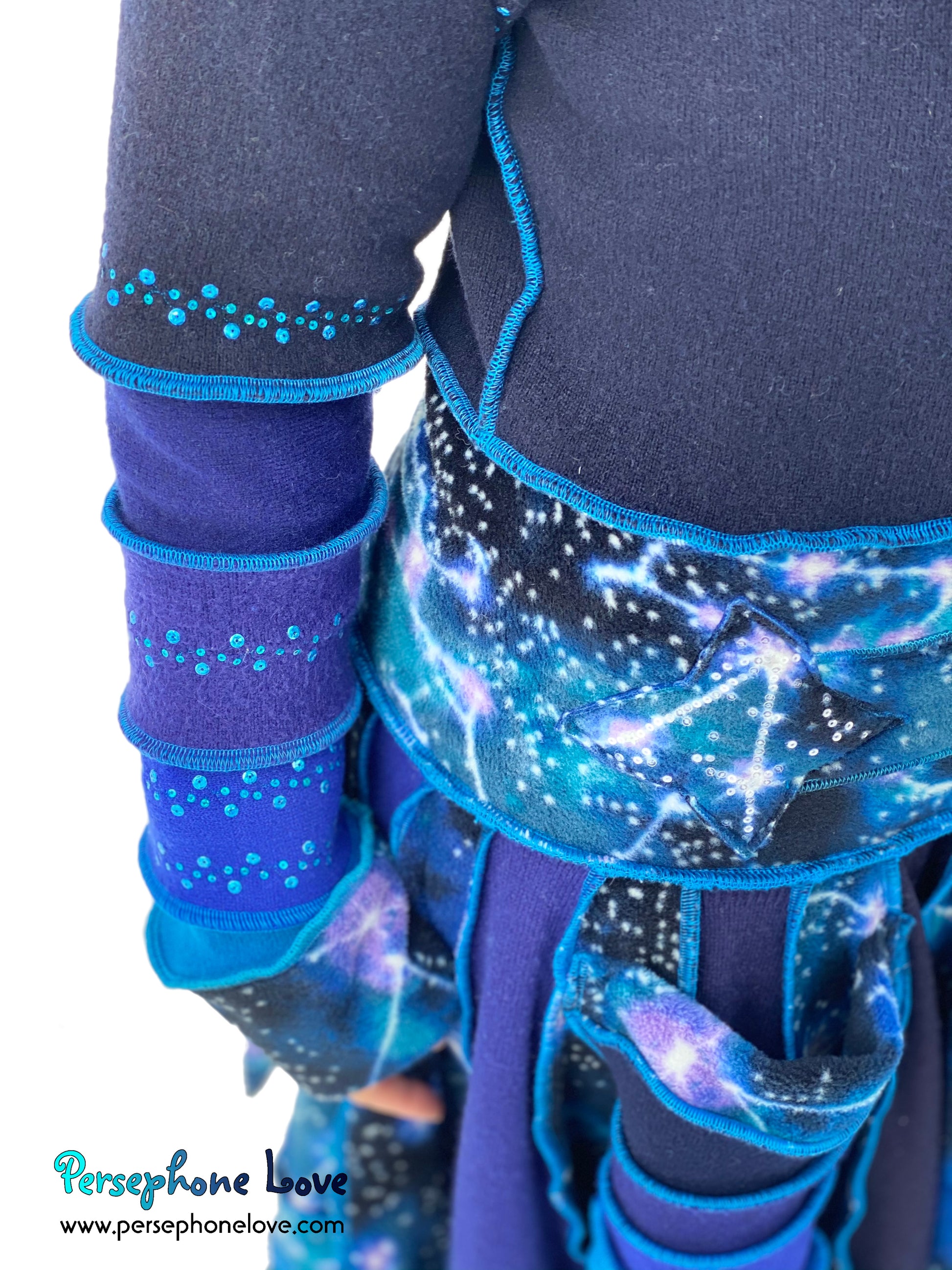 Other notes: This one has a double-felted cashmere bodice so it is heavier and warmer. Literally two 2-ply cashmere sweaters were felted together to make the bodice. It is also absolutely loaded with sequins, all painstakingly sewn on with invisible thread. Like "I went nuts"-level sequins. They are all over the hood, sleeves and on the felted shape attached to the belt ties. They absolutely sparkle in the sunlight.Â