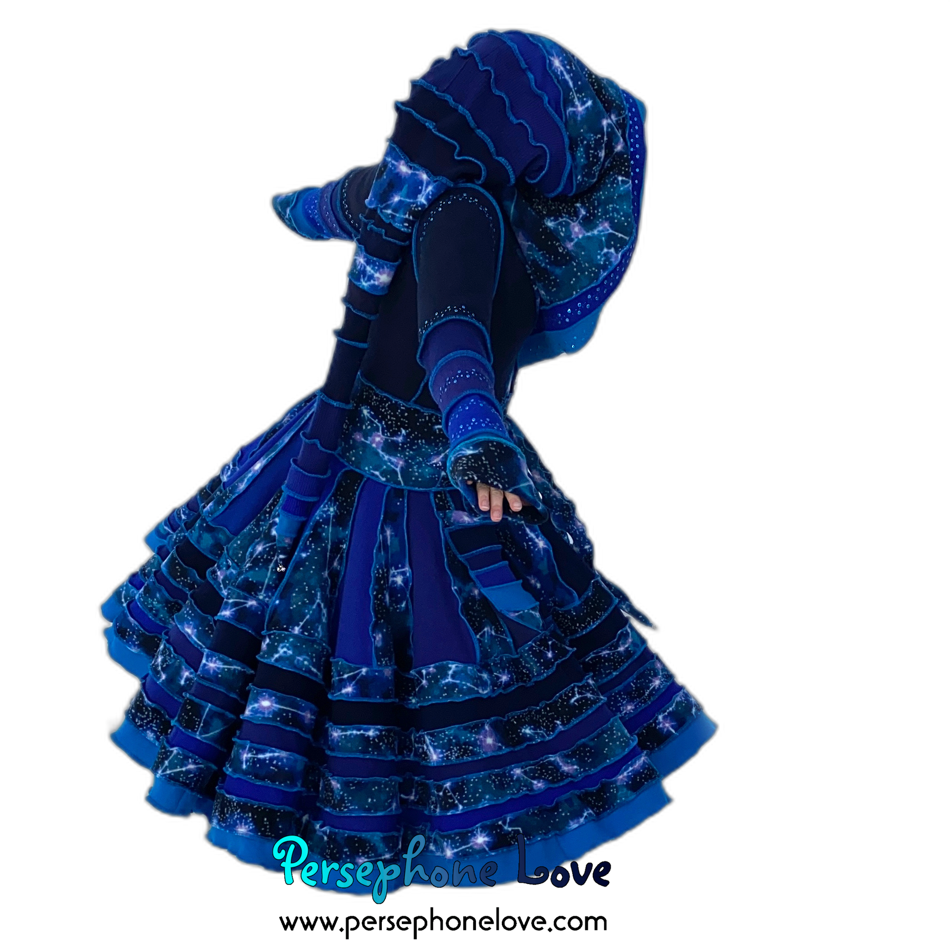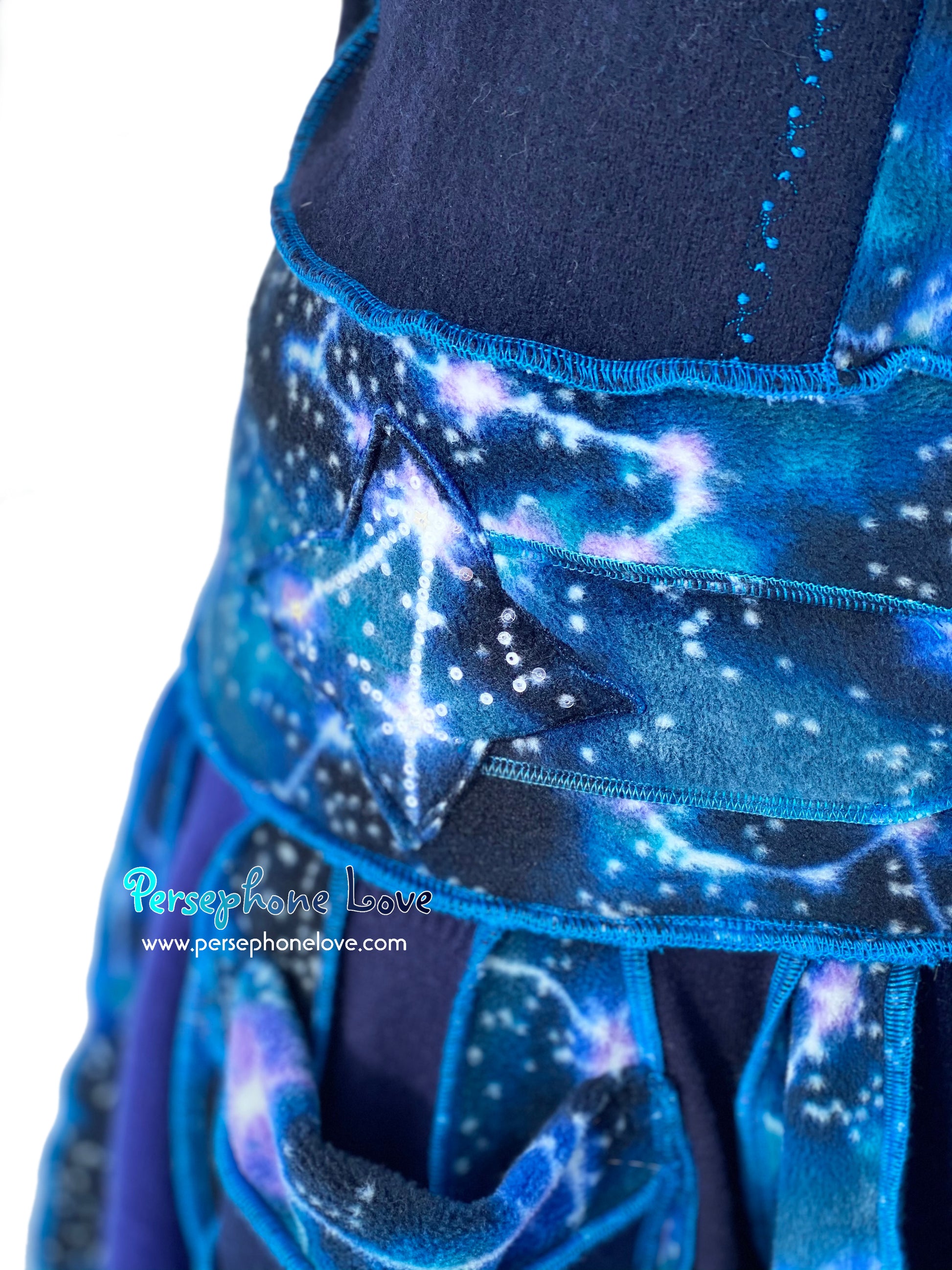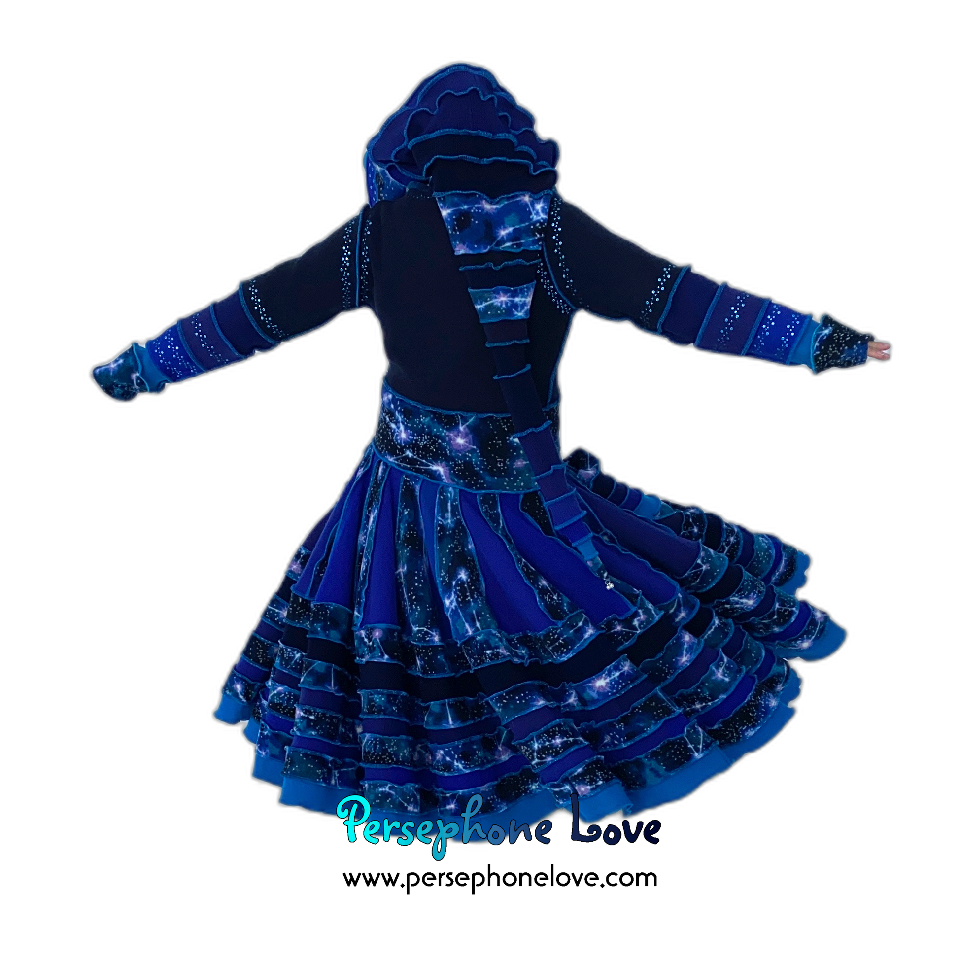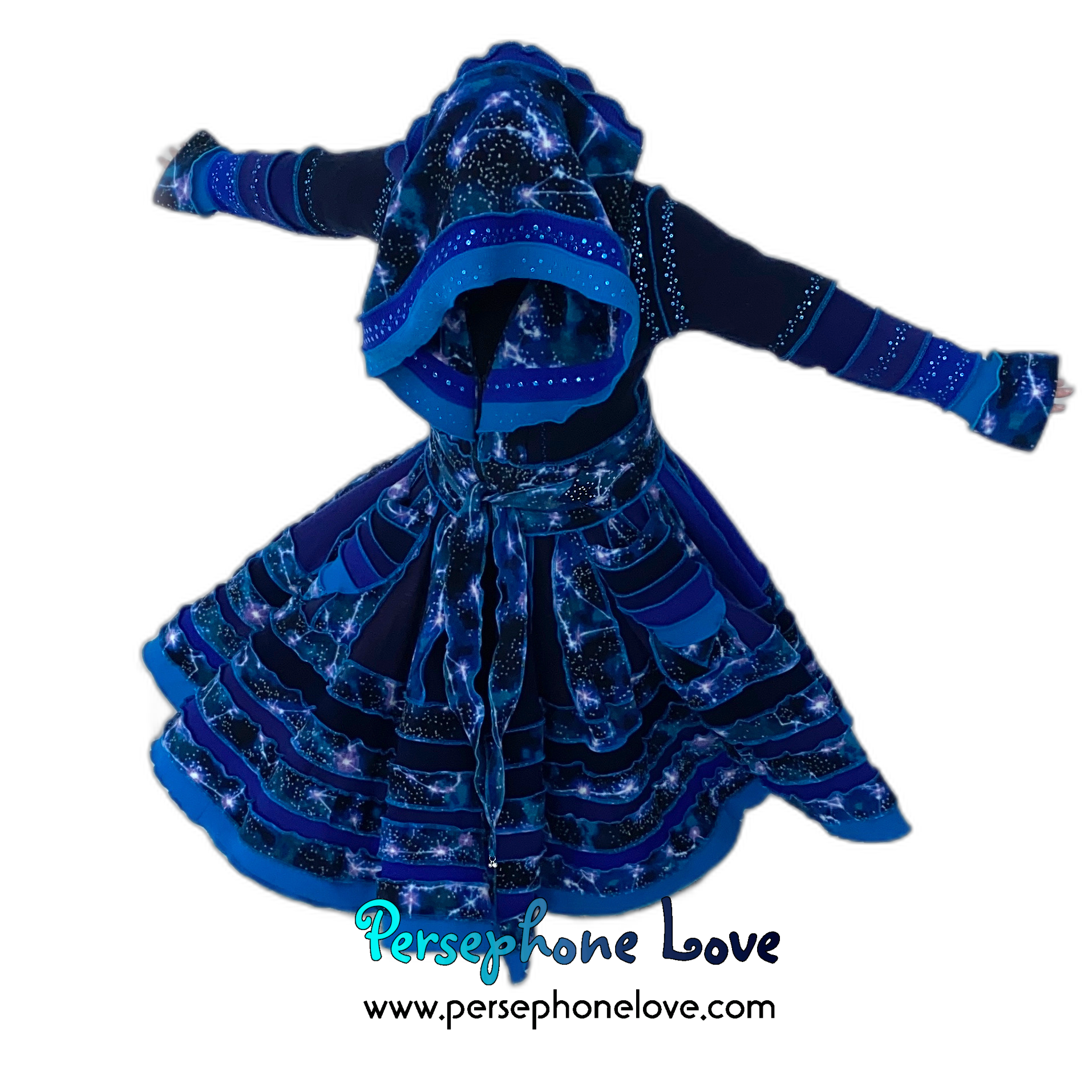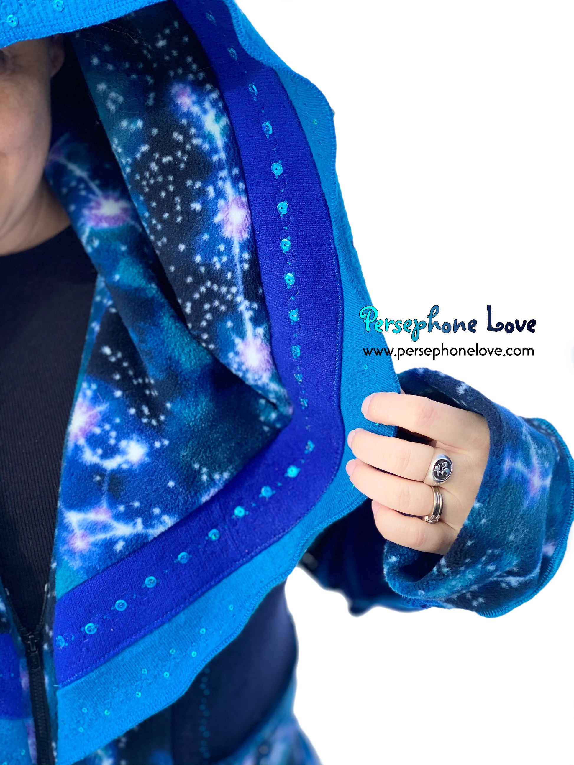 Other notes: This one has a double-felted cashmere bodice so it is heavier and warmer. Literally two 2-ply cashmere sweaters were felted together to make the bodice. It is also absolutely loaded with sequins, all painstakingly sewn on with invisible thread. Like "I went nuts"-level sequins. They are all over the hood, sleeves and on the felted shape attached to the belt ties. They absolutely sparkle in the sunlight.Â