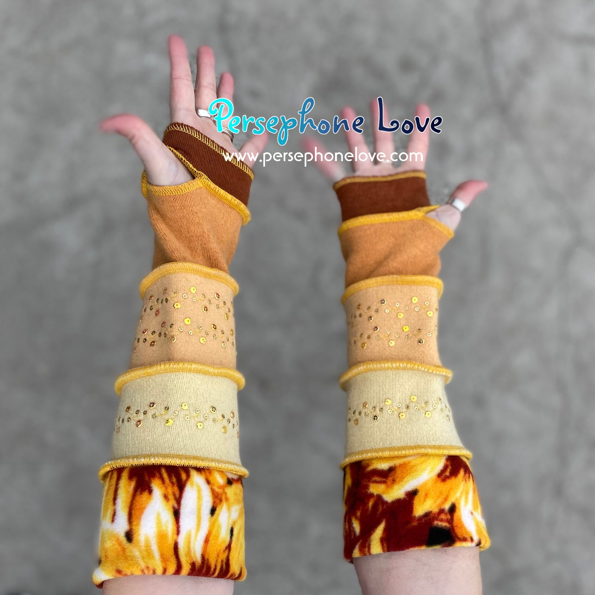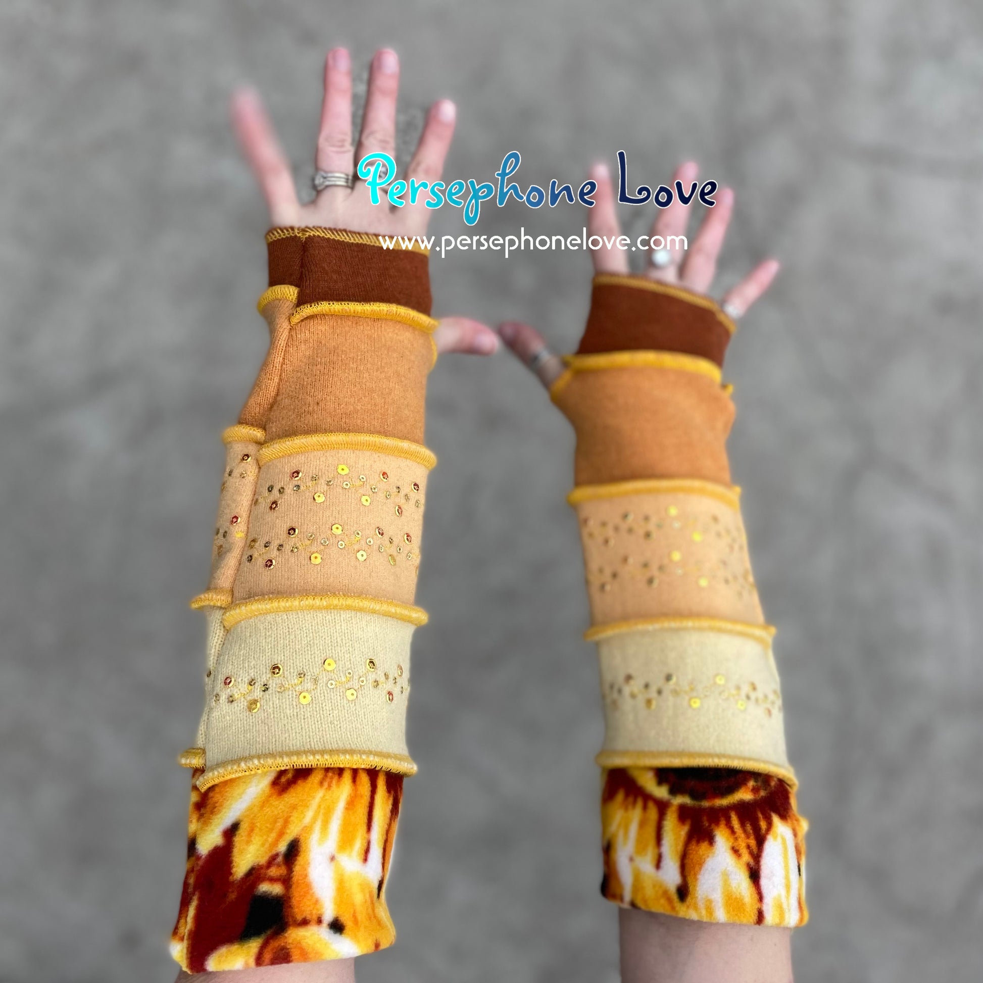 Katwise inspired needle-felted golden sunflower upcycled sweater arm warmers with sequins-1365