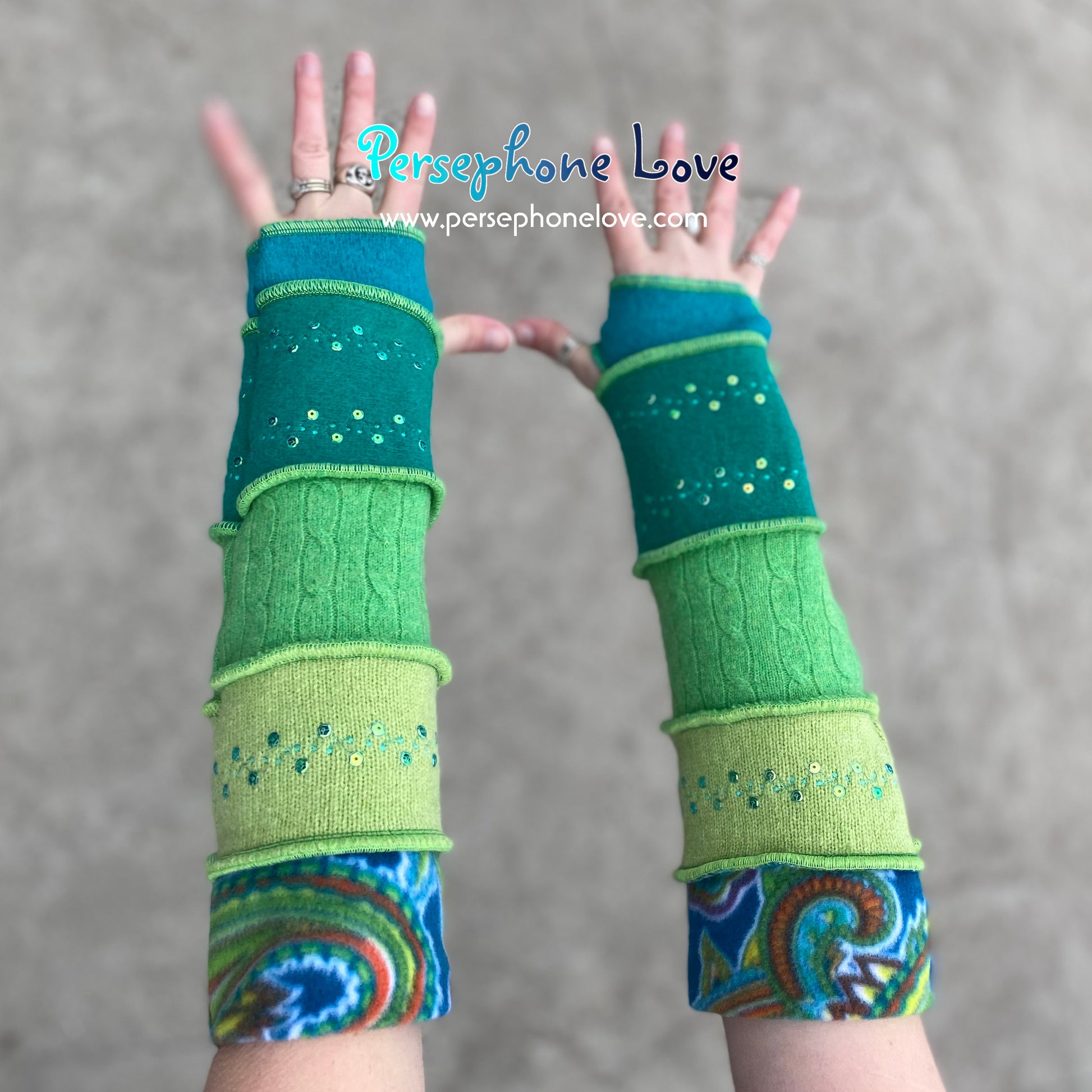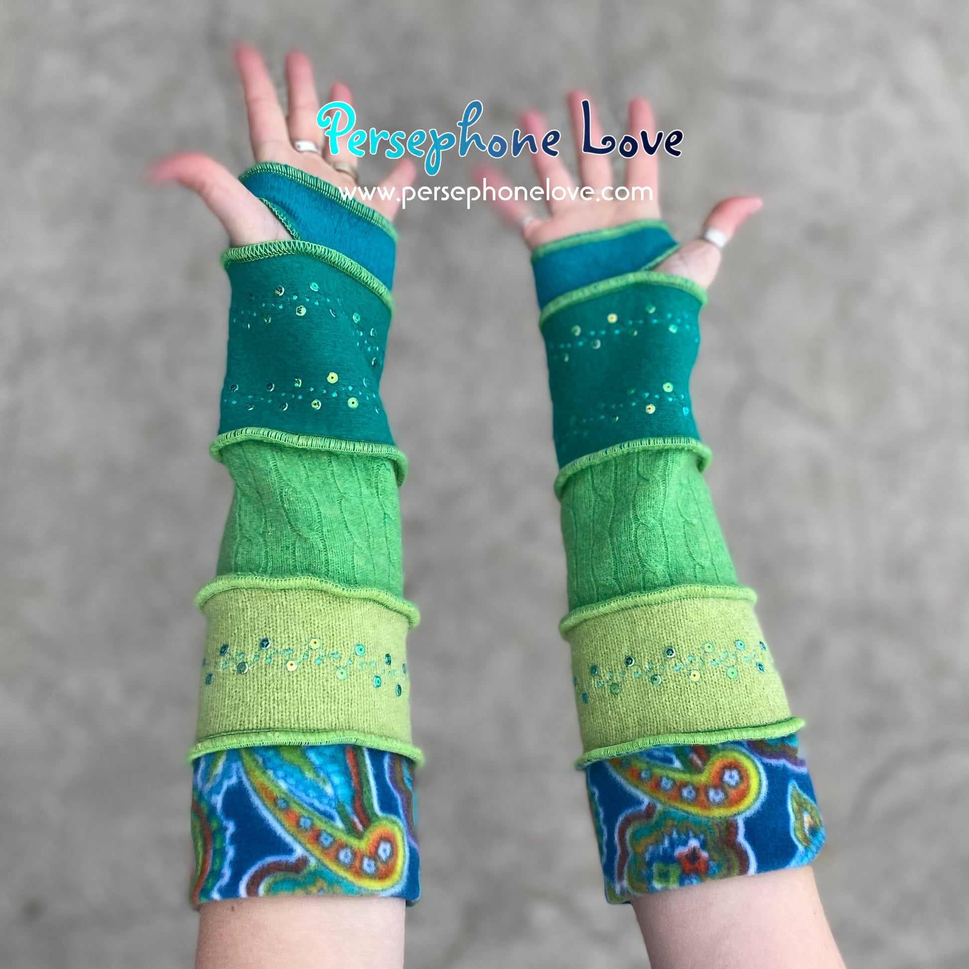 Katwise inspired needle-felted teal blue green upcycled sweater arm warmers embroidery SEQUINS-1374