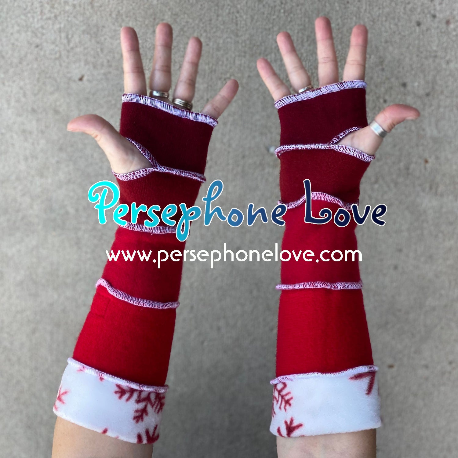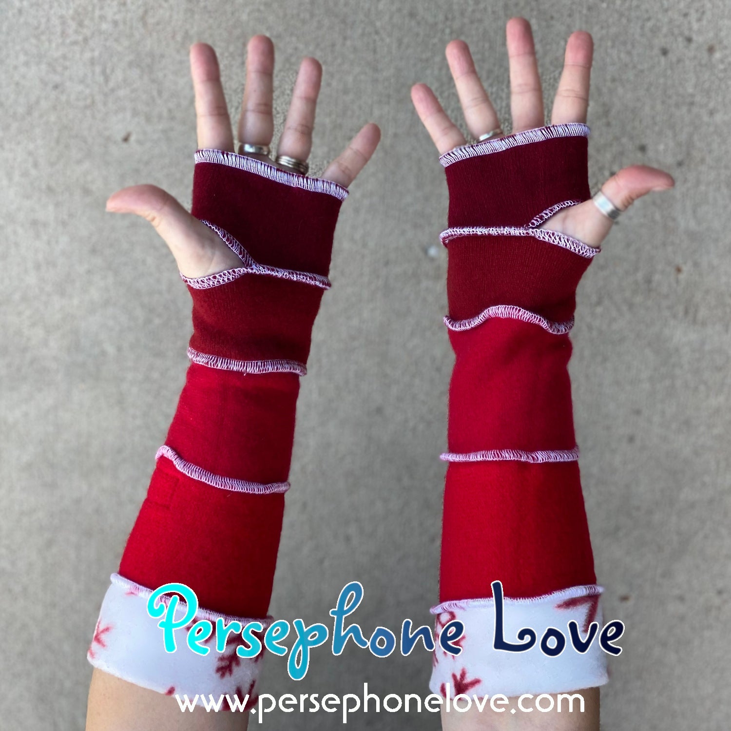 Katwise inspired needle-felted red white snowflake 100% cashmere/fleece upcycled sweater arm warmers -1428