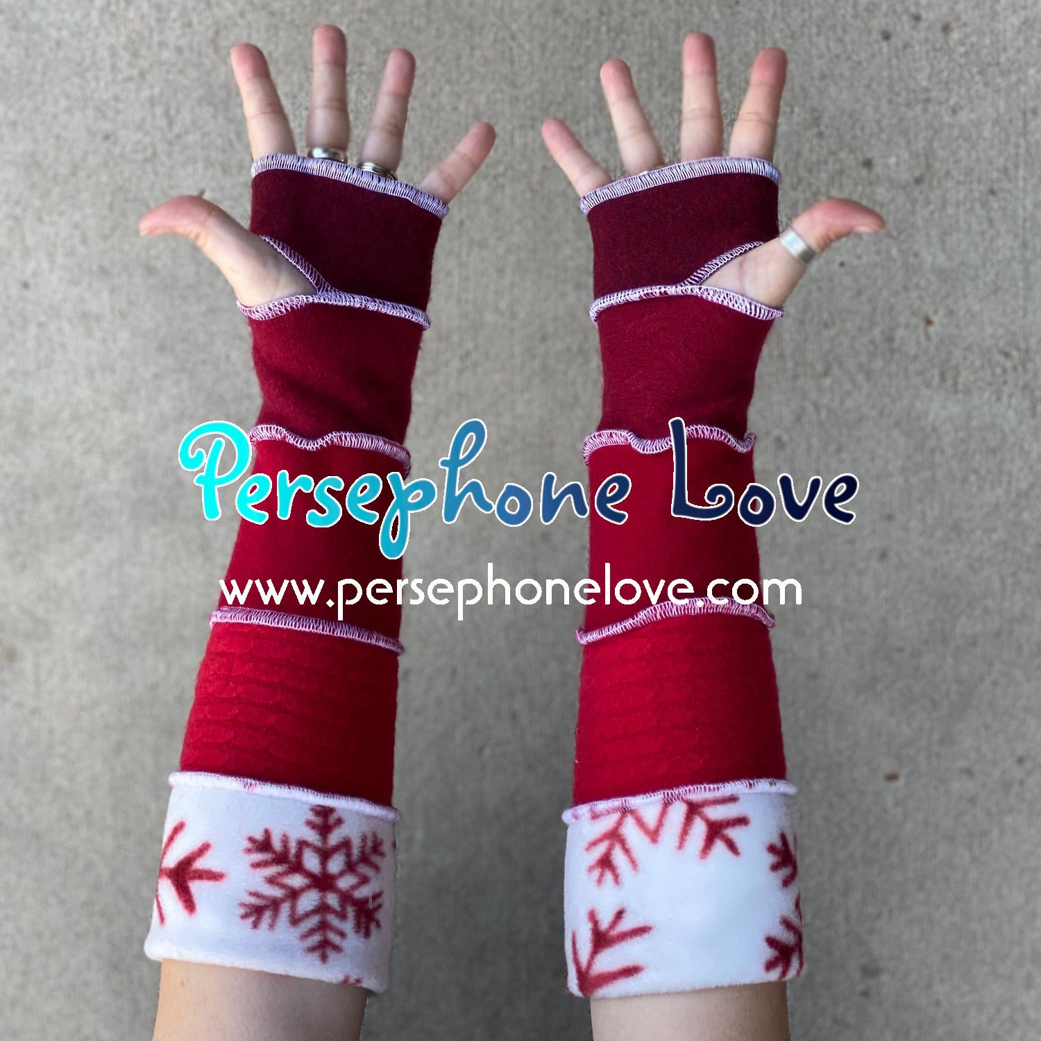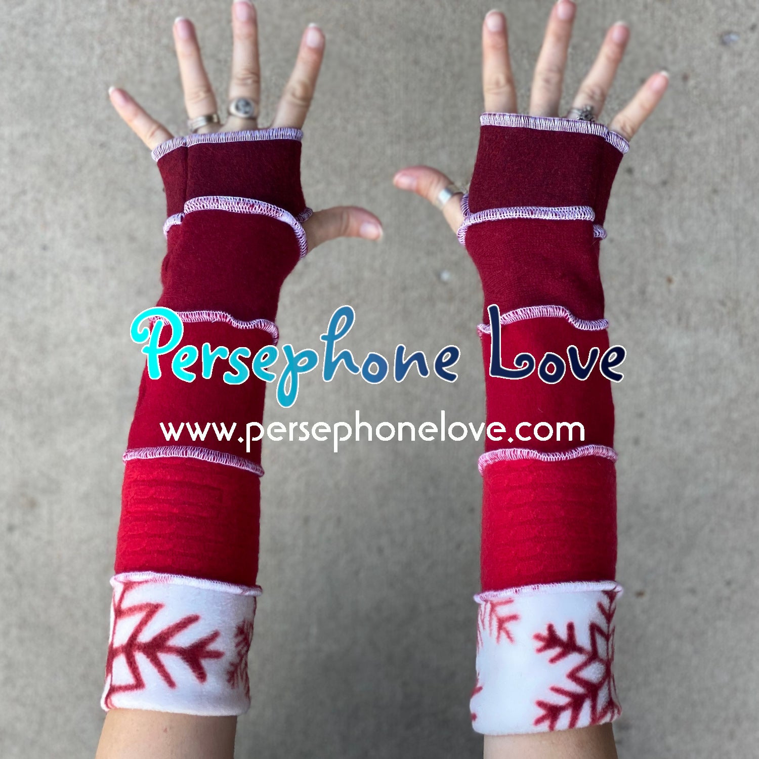 Katwise inspired needle-felted red white snowflake 100% cashmere/fleece upcycled sweater arm warmers -1429