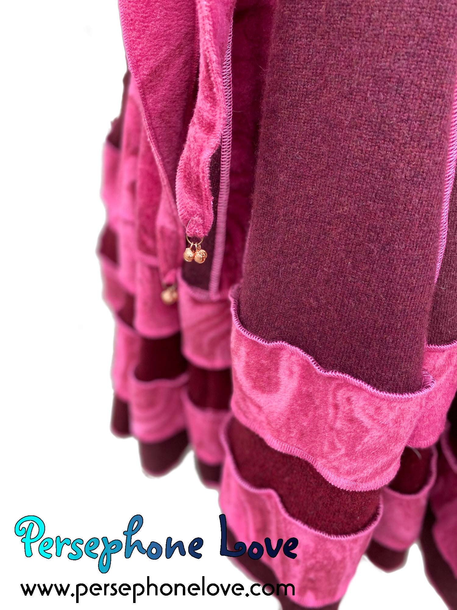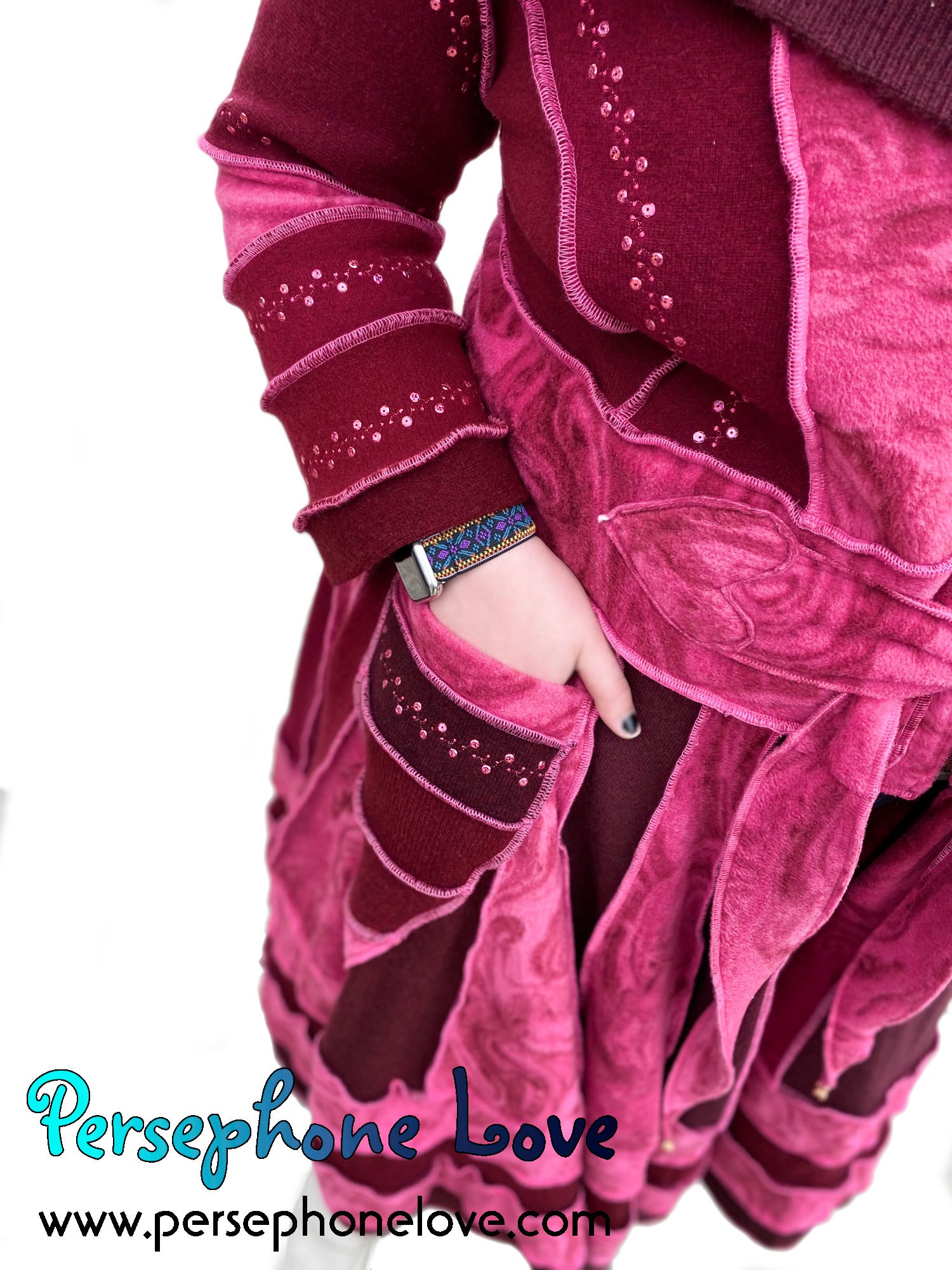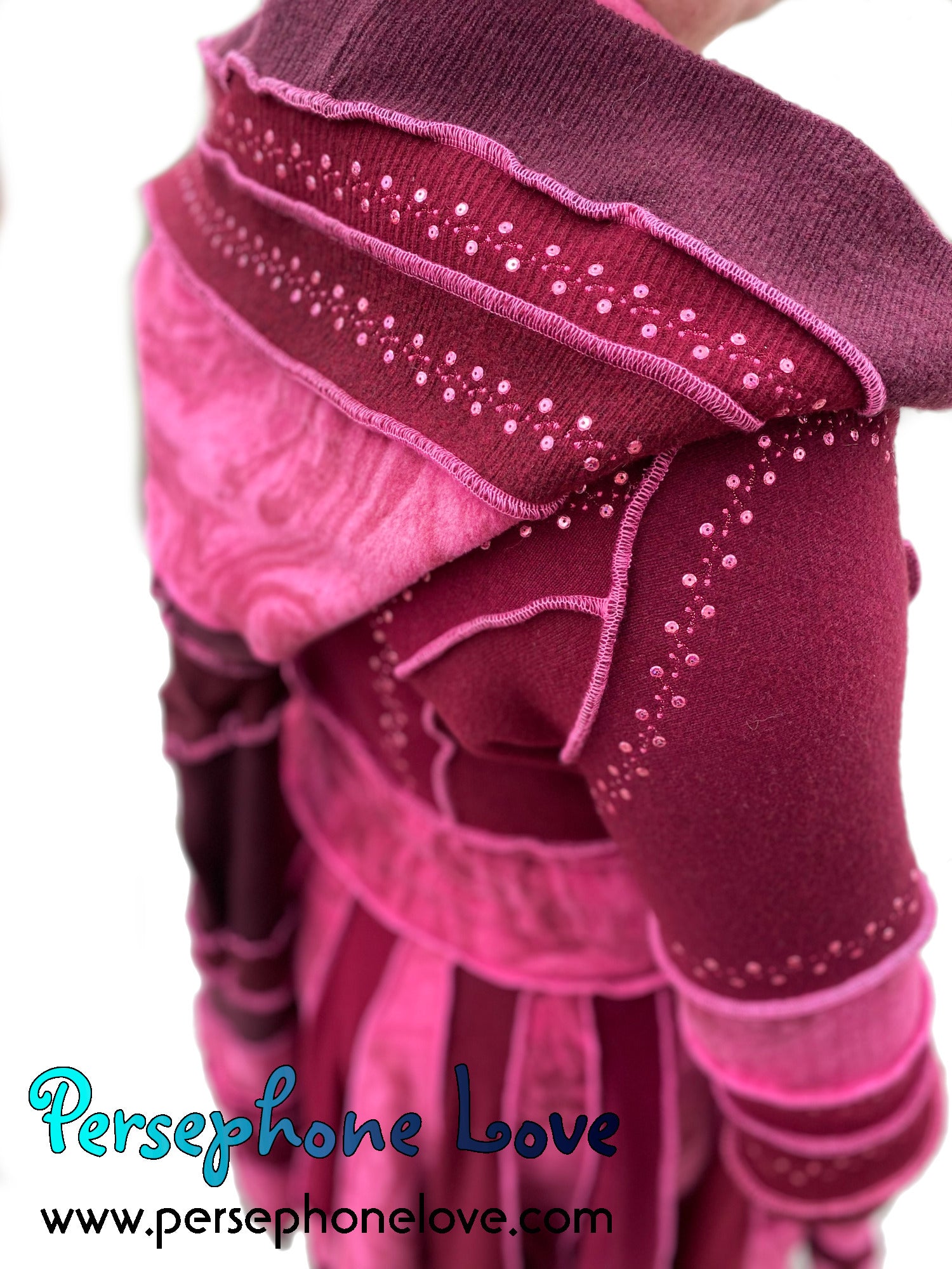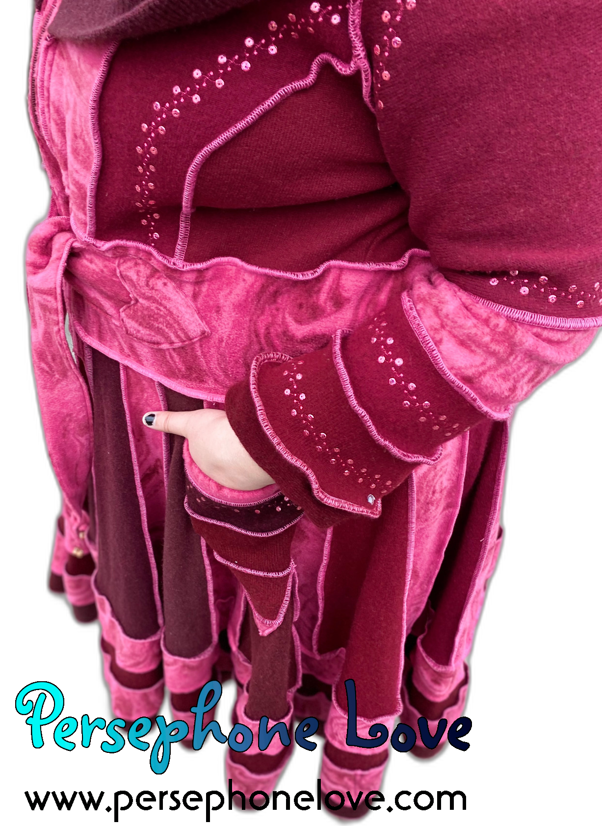 Felted patchwork Katwise inspired recycled sweatercoats - vastly different from others you might have seen. These are painstakingly machine-needle-felted for way better durability, warmth and better fit. The felting creates a completely different garment and also provides enough structure for machine embroidery and sparkling sequin work (most coats have this). Most contain buttery-soft, luxurious recycled cashmere. This one 100% cashmere. Mixed with fleece for visual flare. These coats take about ~30+ hours to make.