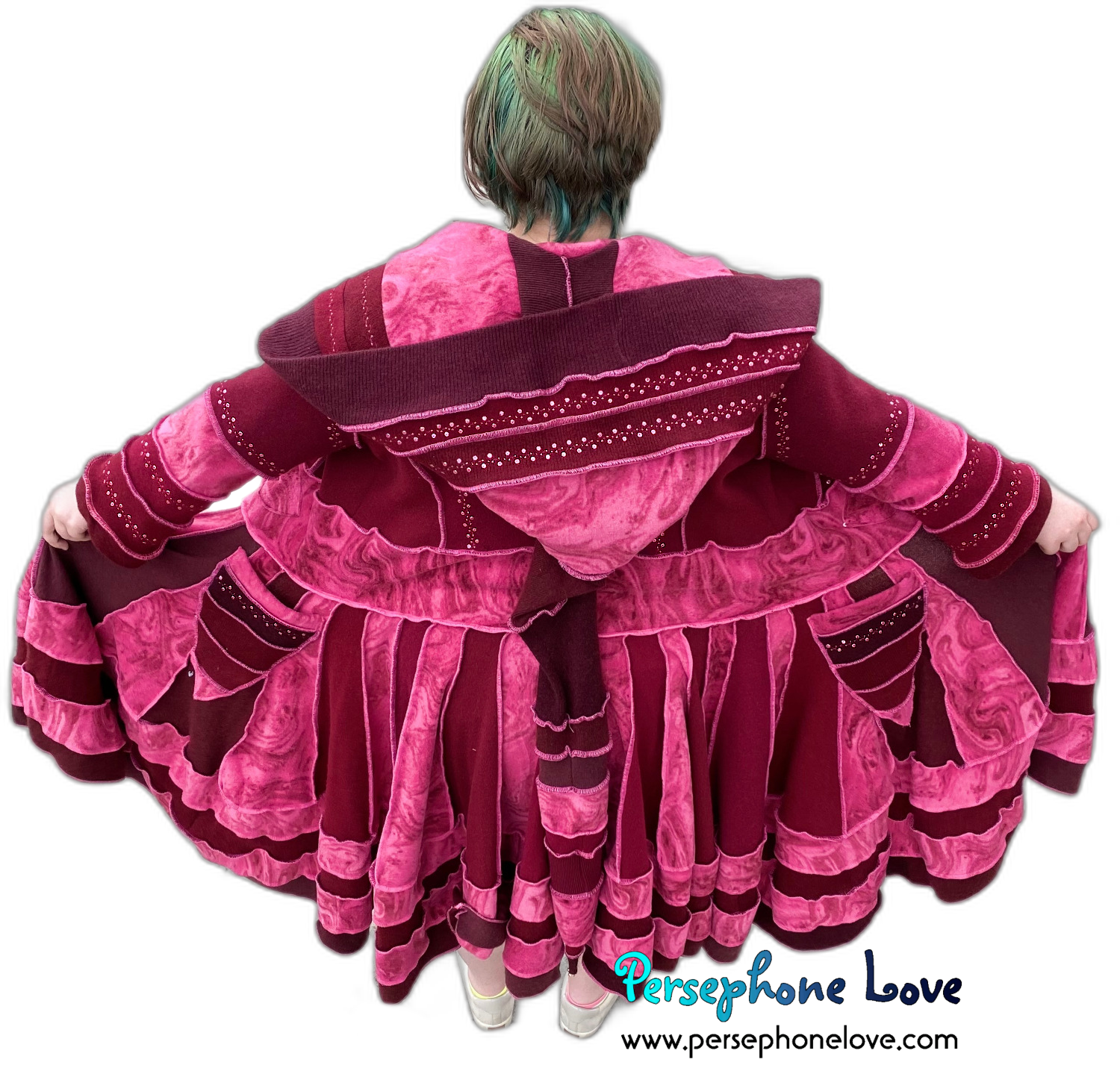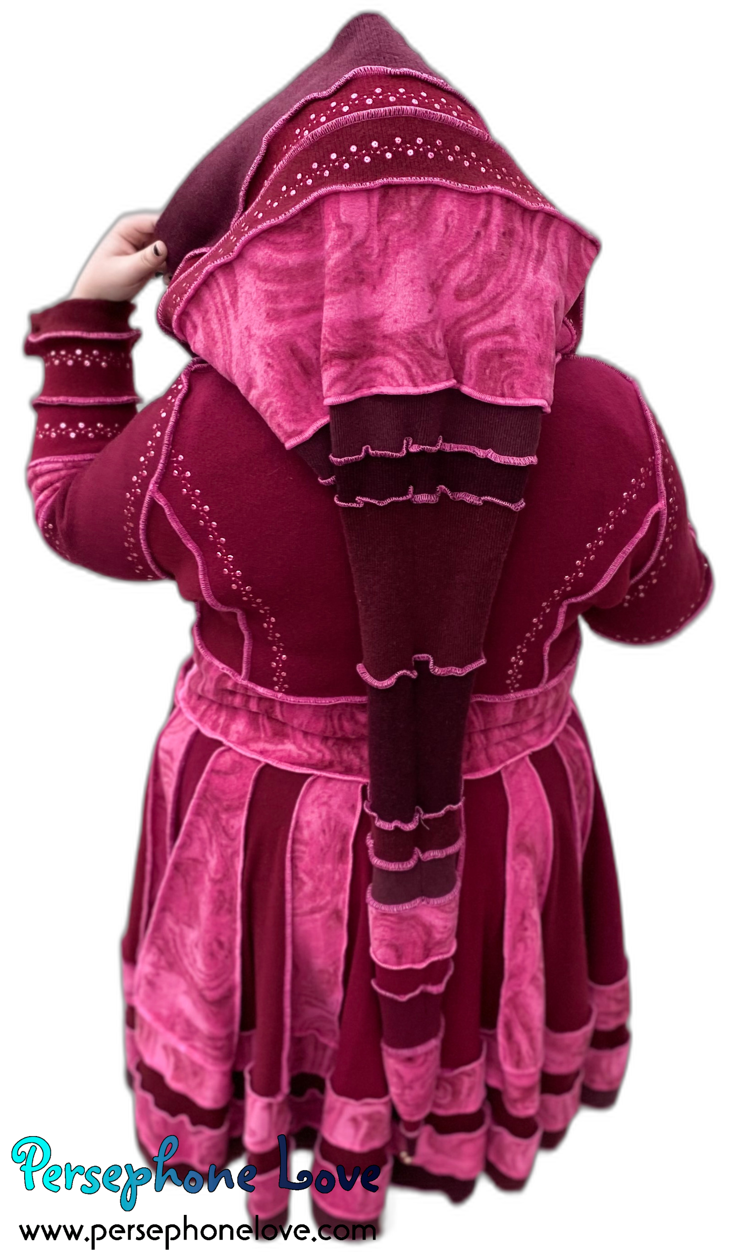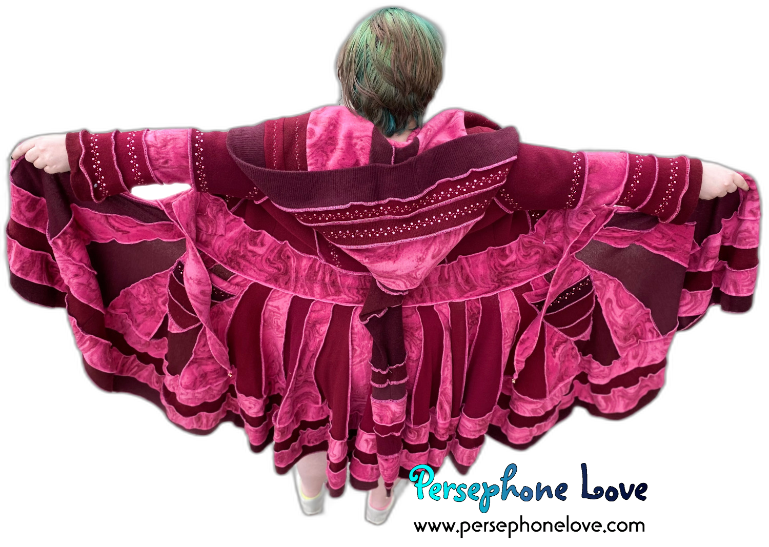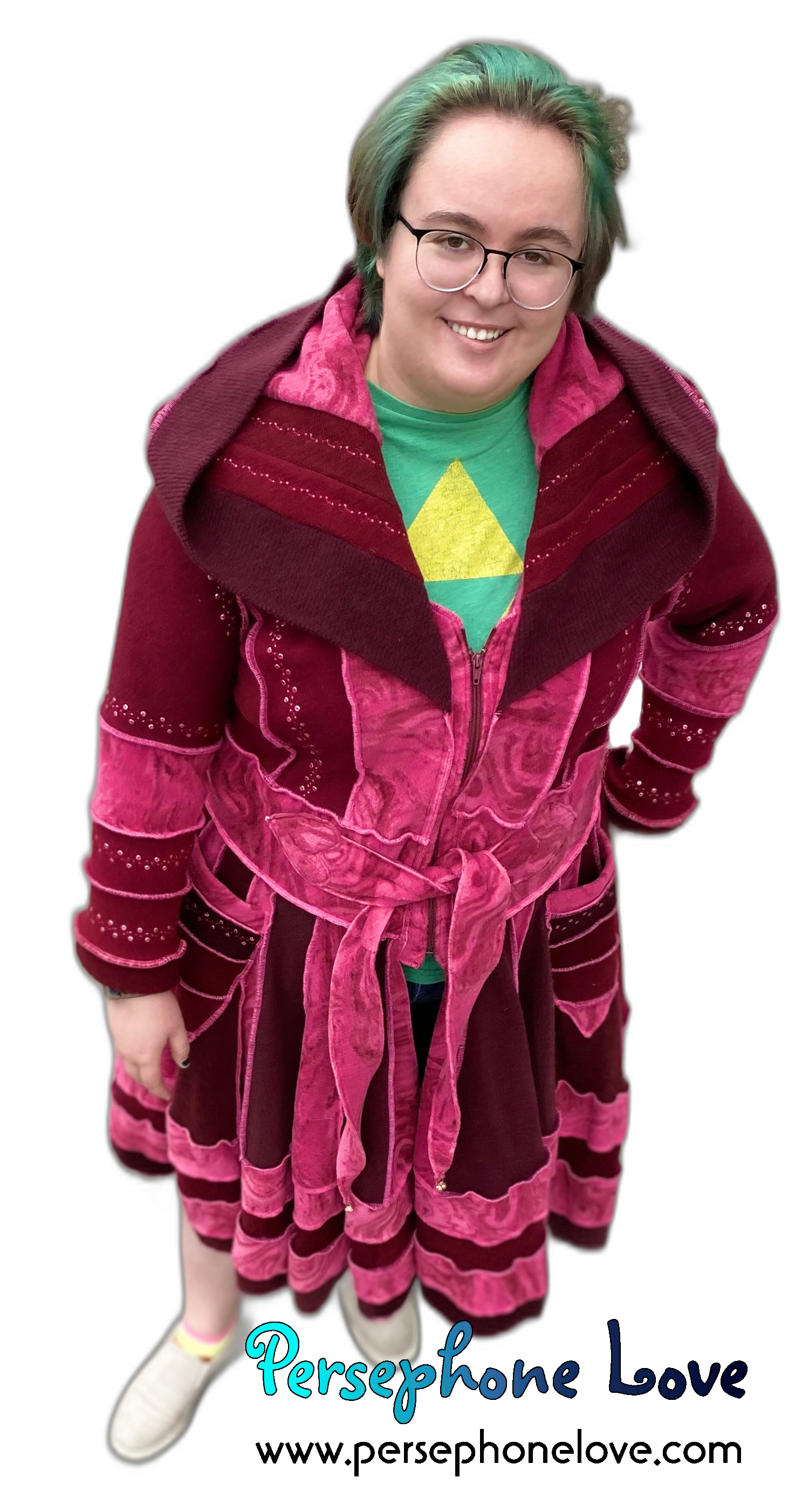 Felted patchwork Katwise inspired recycled sweatercoats - vastly different from others you might have seen. These are painstakingly machine-needle-felted for way better durability, warmth and better fit. The felting creates a completely different garment and also provides enough structure for machine embroidery and sparkling sequin work (most coats have this). Most contain buttery-soft, luxurious recycled cashmere. This one 100% cashmere. Mixed with fleece for visual flare. These coats take about ~30+ hours to make.