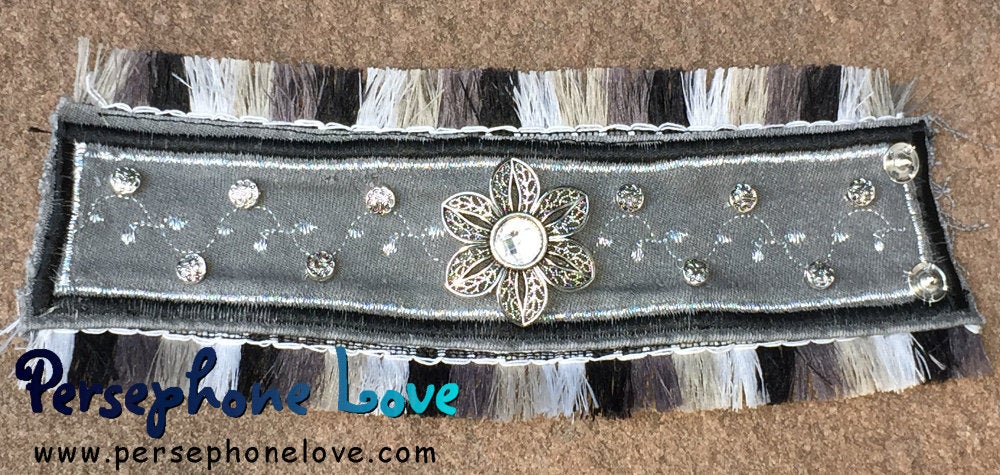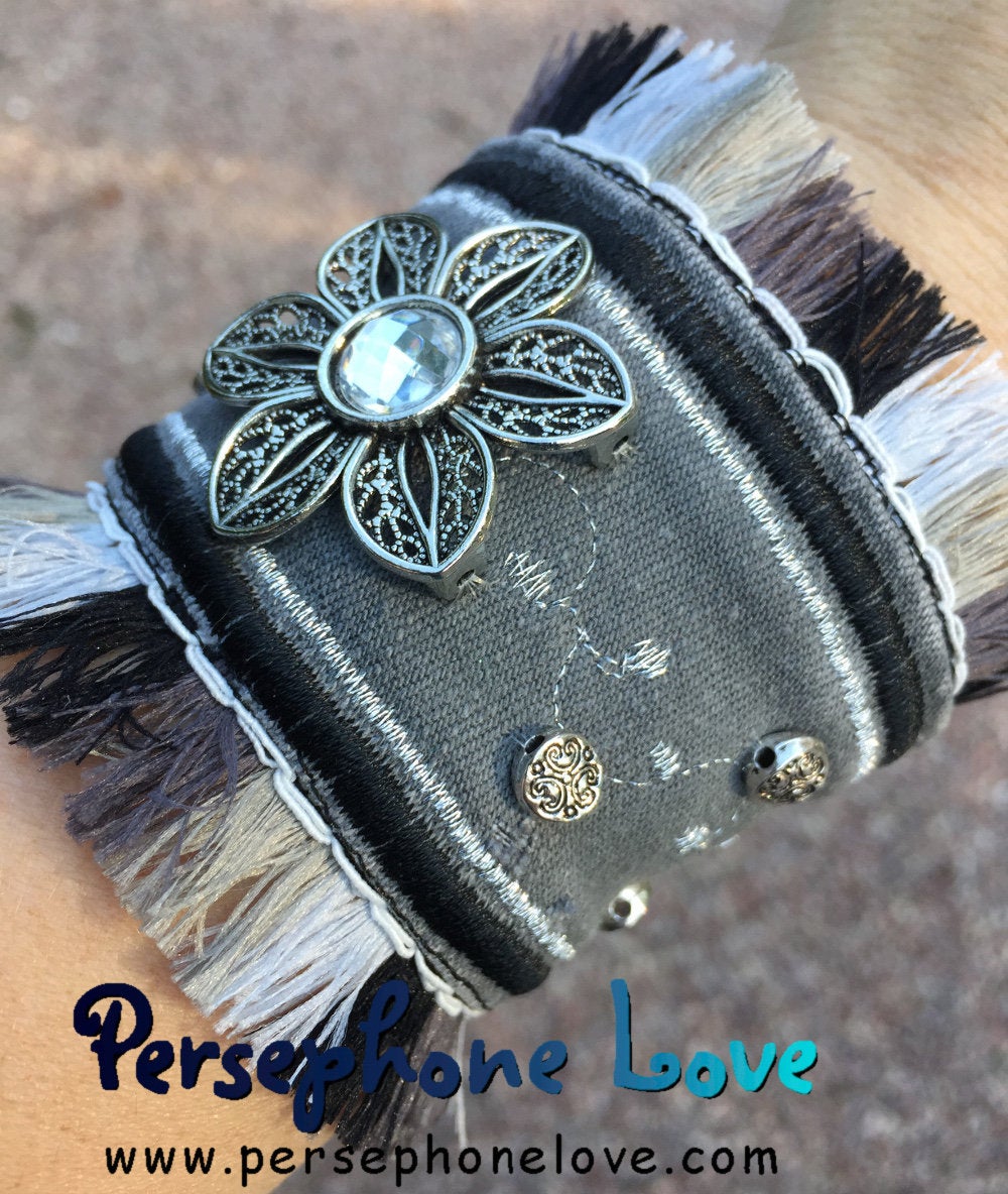 This lovely grey, black and silver boho look bracelet is made from the waistband of grey denim jeans which I scour thrift stores to find. Shiny black embroidery graces the outer edge, along with silver embroidery in a double-border design. Beautiful color-changing fringe adorns the edges. An alternating tiny leaf design has been painstakingly embroidered through the middle of the cuff in the silver metallic thread and silver alloy beads with a delicate etched flower design are painstakingly sewn on with invisible thread (which is a pain!) but produces a far better-looking item. The final touch is a clear/silver filigree flower. It is truly a labor of love! From cutting up the denim, to embroidery, to hand sewing, to photograph and listing, this takes about two hours to make. These are NOT adjustable - need a different size? Check my other items as I try to vary the sizes and designs, so each bracelet is slightly different.
