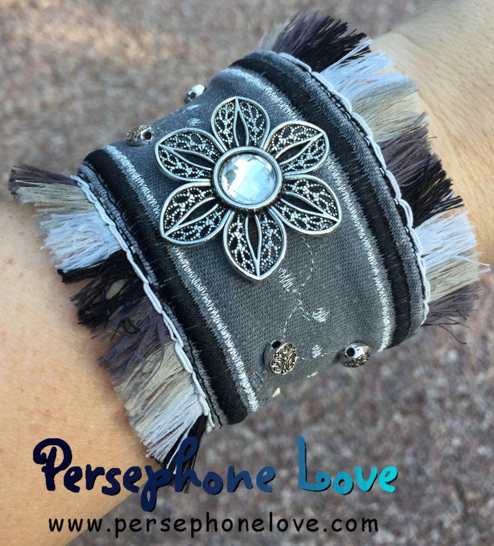 Grey black silver embroidered beaded upcycled denim bracelet flower filigree jewelry-1132