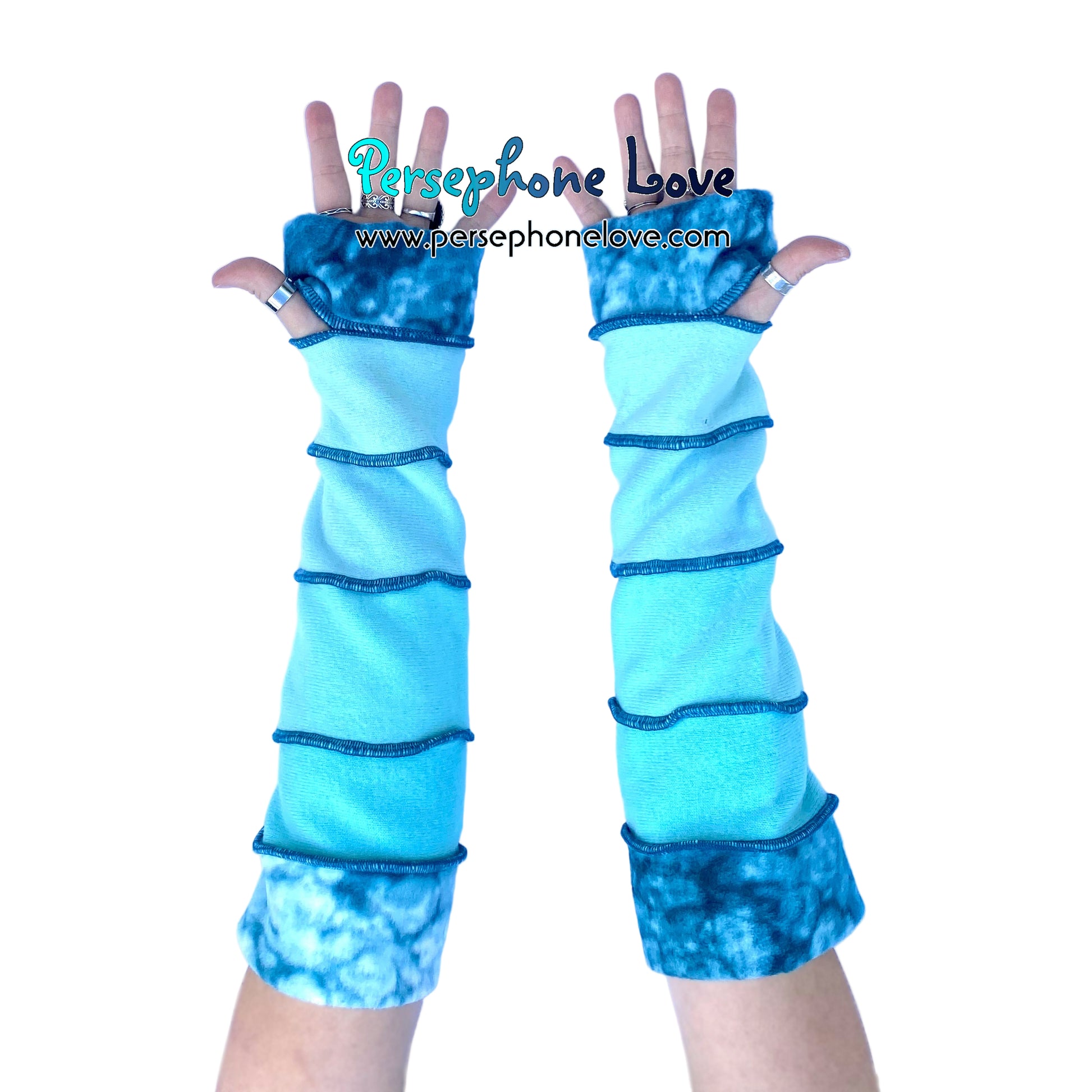 Needle-felted upcycled 100% cashmere arm warmers with thumb holes. The machine-needle-felting process makes these twice as thick and super warm. It also takes a lot longer to make these than other Katwise-style arm-warmers you may have seen, which is why they cost what they do (that plus cashmere is just a more expensive material and double-thickness is double-materials-cost). One size fits most and they are thick enough not to "droop" on you but still buttery soft and luxuriously comfortable. Sized generally for smaller adult bone structure but not intending to exclude anyone. I just want them to fit. They are impossible to perfectly measure, but I've done my best to give you some rough measurements to help out. đ
