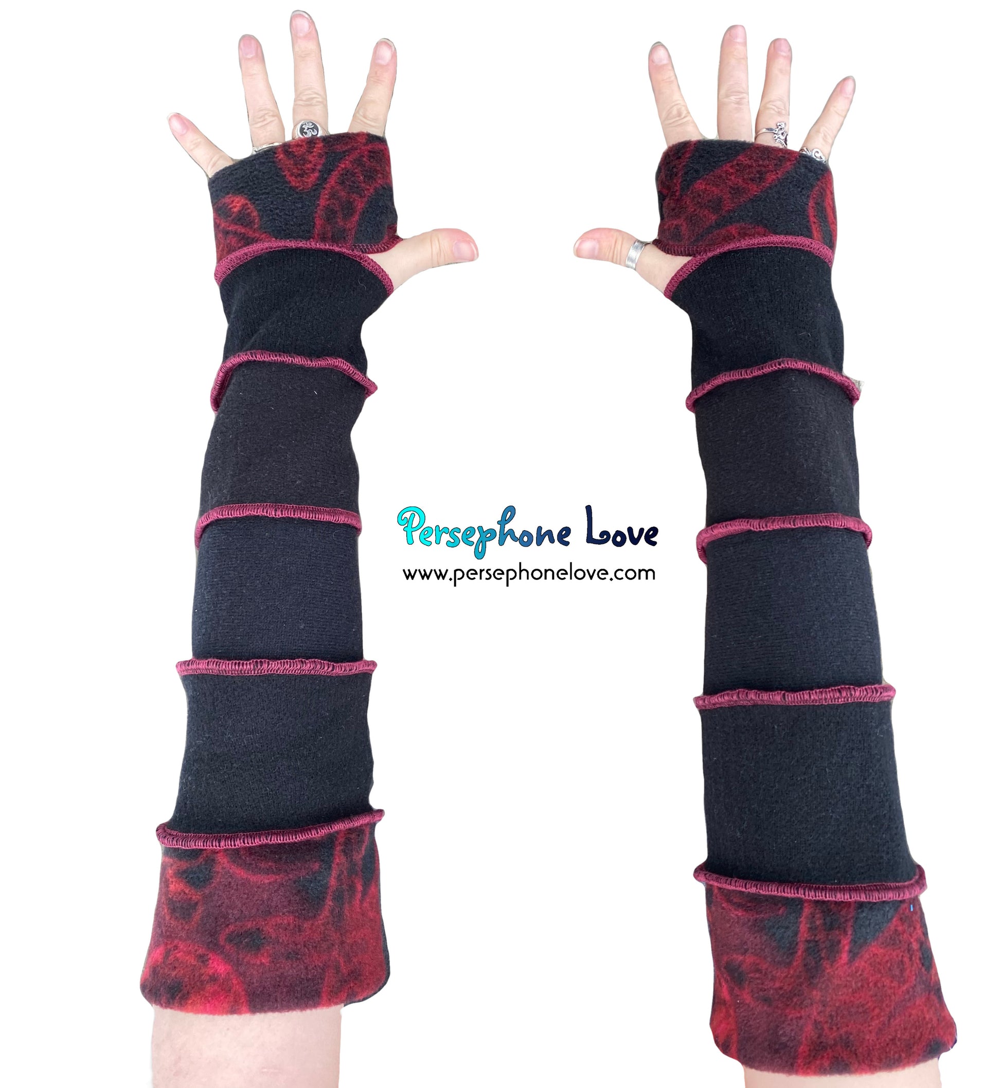 Needle-felted upcycled 100% cashmere arm warmers with thumb holes. The machine-needle-felting process makes these twice as thick and super warm. It also takes a lot longer to make these than other Katwise-style arm-warmers you may have seen, which is why they cost what they do (that plus cashmere is just a more expensive material and double-thickness is double-materials-cost). One size fits most and they are thick enough not to "droop" on you but still buttery soft and luxuriously comfortable. Sized generally for smaller adult bone structure but not intending to exclude anyone. I just want them to fit. They are impossible to perfectly measure, but I've done my best to give you some rough measurements to help out. đ