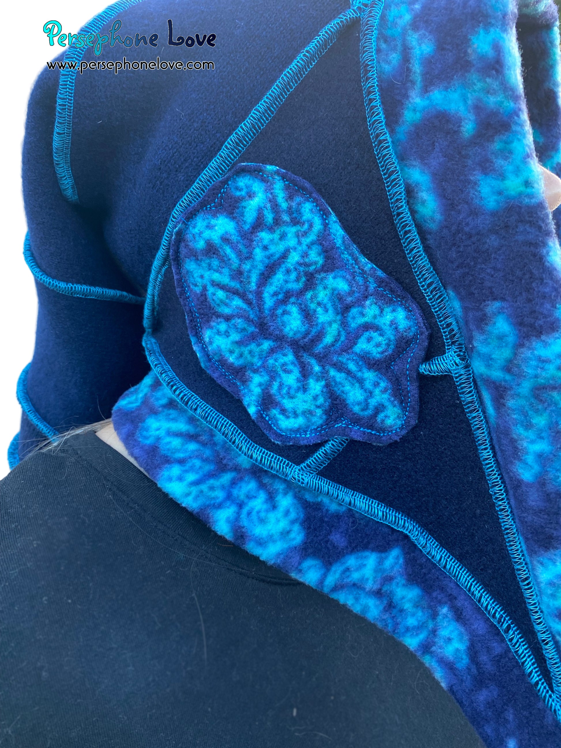 This one is a hybrid between my regular hats and the hoods. It has long flaps that hang down on the sides to keep your ears warm and cozy. This particular hat is one of my BEST. Note the embroidery and sparkling sequins, all painstakingly sewn/woven into the fibers with invisible thread. FAR superior than just gluing stuff. It also has a pair of cute gold clapperless bells sewn onto the tail (like the kind of bells you find on drawstrings on hippie-type elastic-waist skirts, if that helps.)