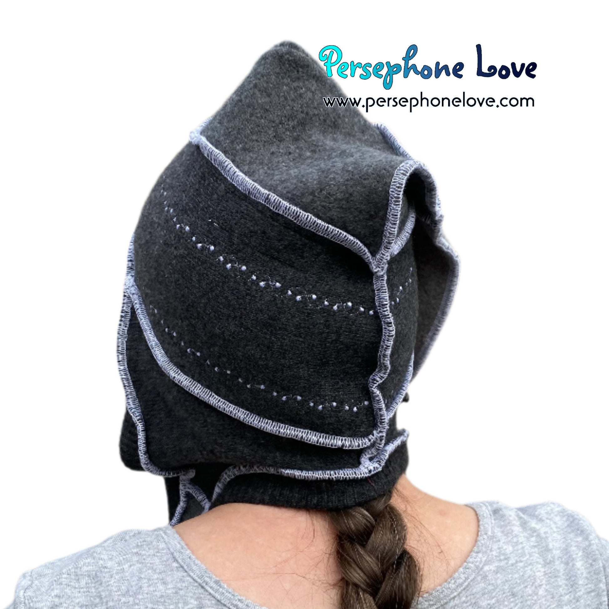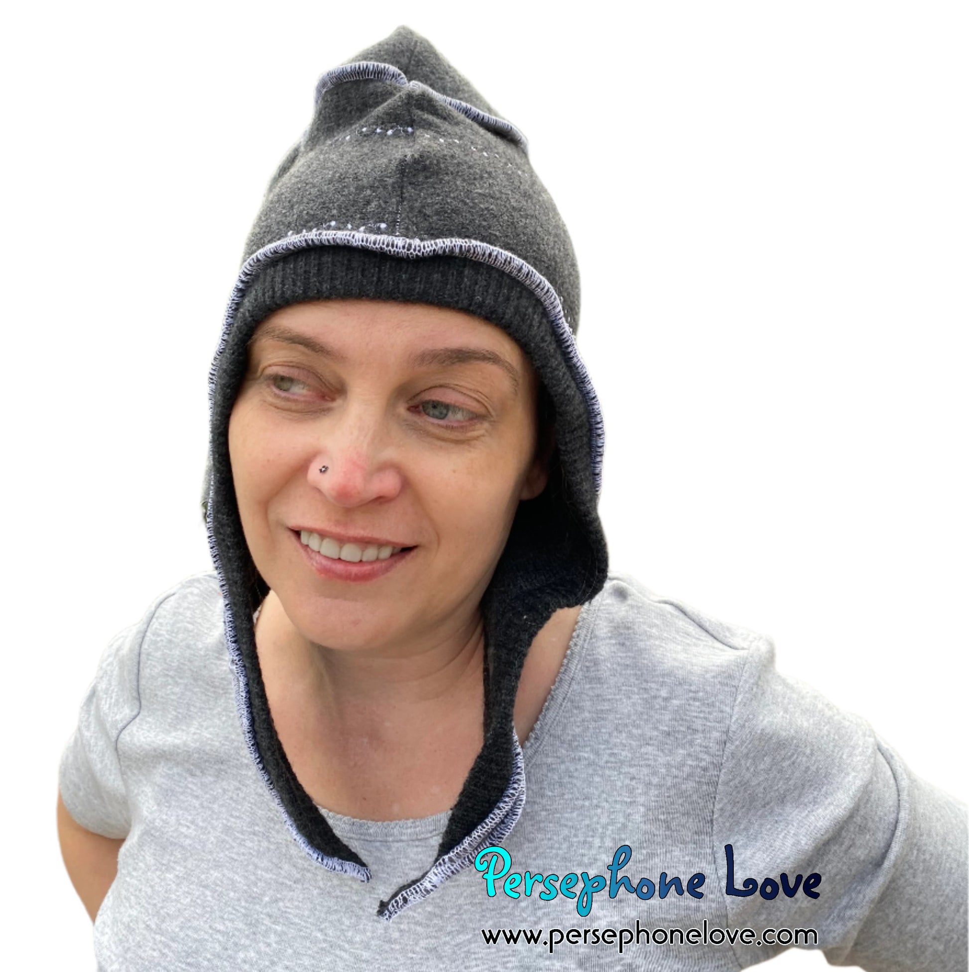 This one is a hybrid between my regular hats and the hoods. It has long flaps that hang down on the sides to keep your ears warm and cozy. Has embroidery in shining white thread. It also has a pair of cute clapperless bells sewn onto the tail (like the kind of bells you find on drawstrings on hippie-type elastic-waist skirts, if that helps.)