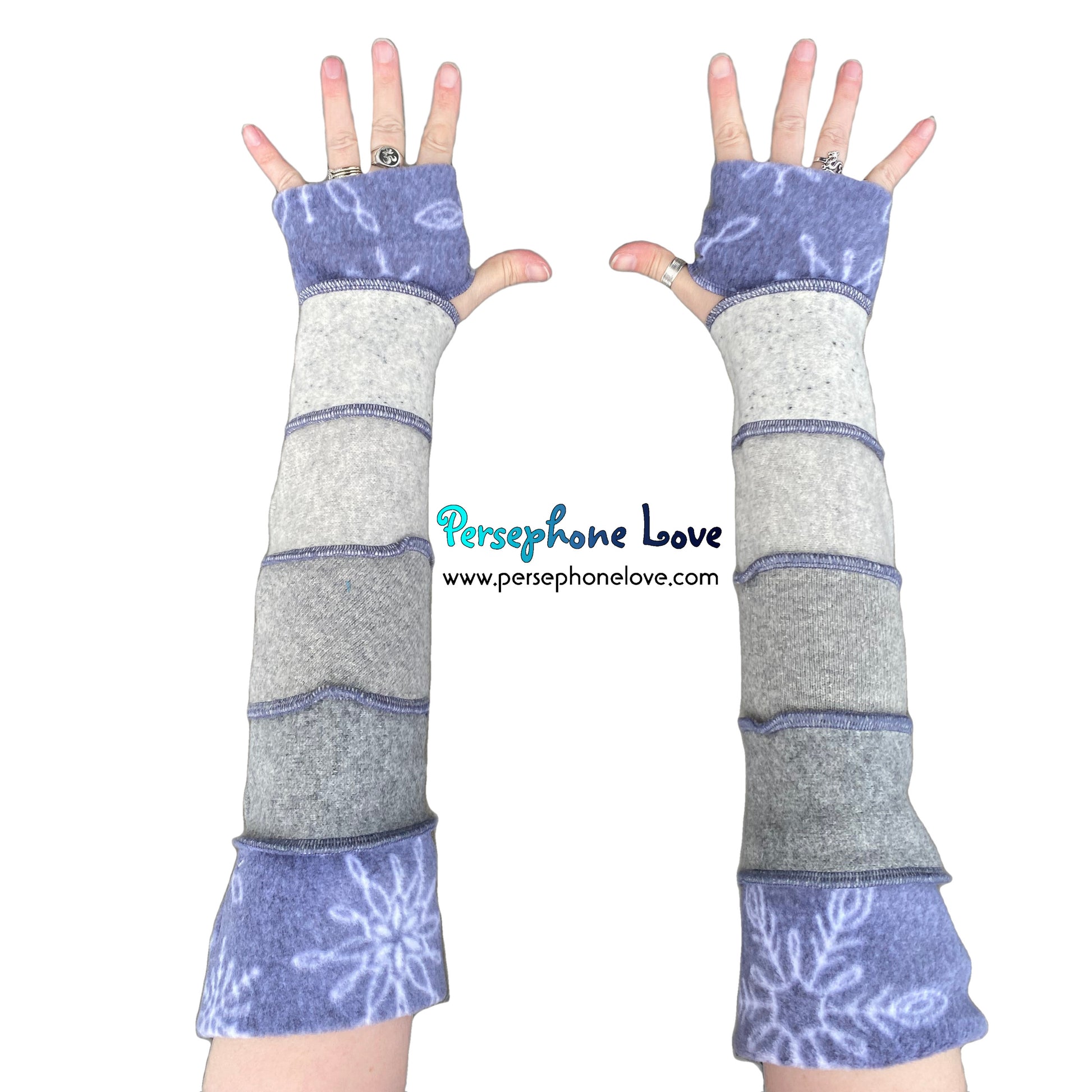 Needle-felted upcycled 100% cashmere arm warmers with thumb holes. The machine-needle-felting process makes these twice as thick and super warm. It also takes a lot longer to make these than other Katwise-style arm-warmers you may have seen, which is why they cost what they do (that plus cashmere is just a more expensive material and double-thickness is double-materials-cost). One size fits most and they are thick enough not to "droop" on you but still buttery soft and luxuriously comfortable. Sized generally for smaller adult bone structure but not intending to exclude anyone. I just want them to fit. They are impossible to perfectly measure, but I've done my best to give you some rough measurements to help out. đ