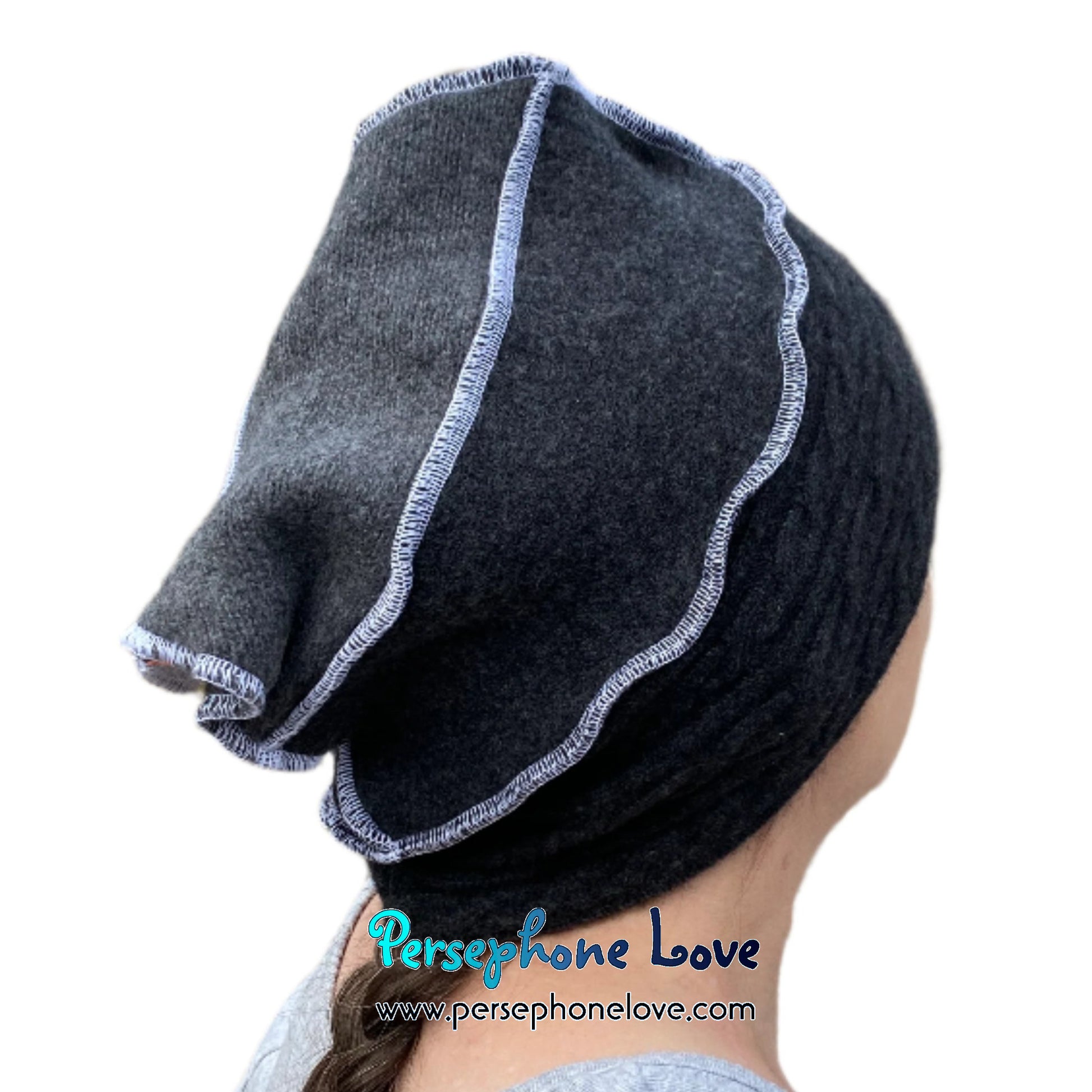 Part of my handmade felted 100% cashmere/fleece hat line. The machine needle-felting process makes this much softer and warmer than anything non-felted (and takes a LOT longer to make, which accounts for the cost). Stretchy material fits most but do take a look at the rough measurements below.