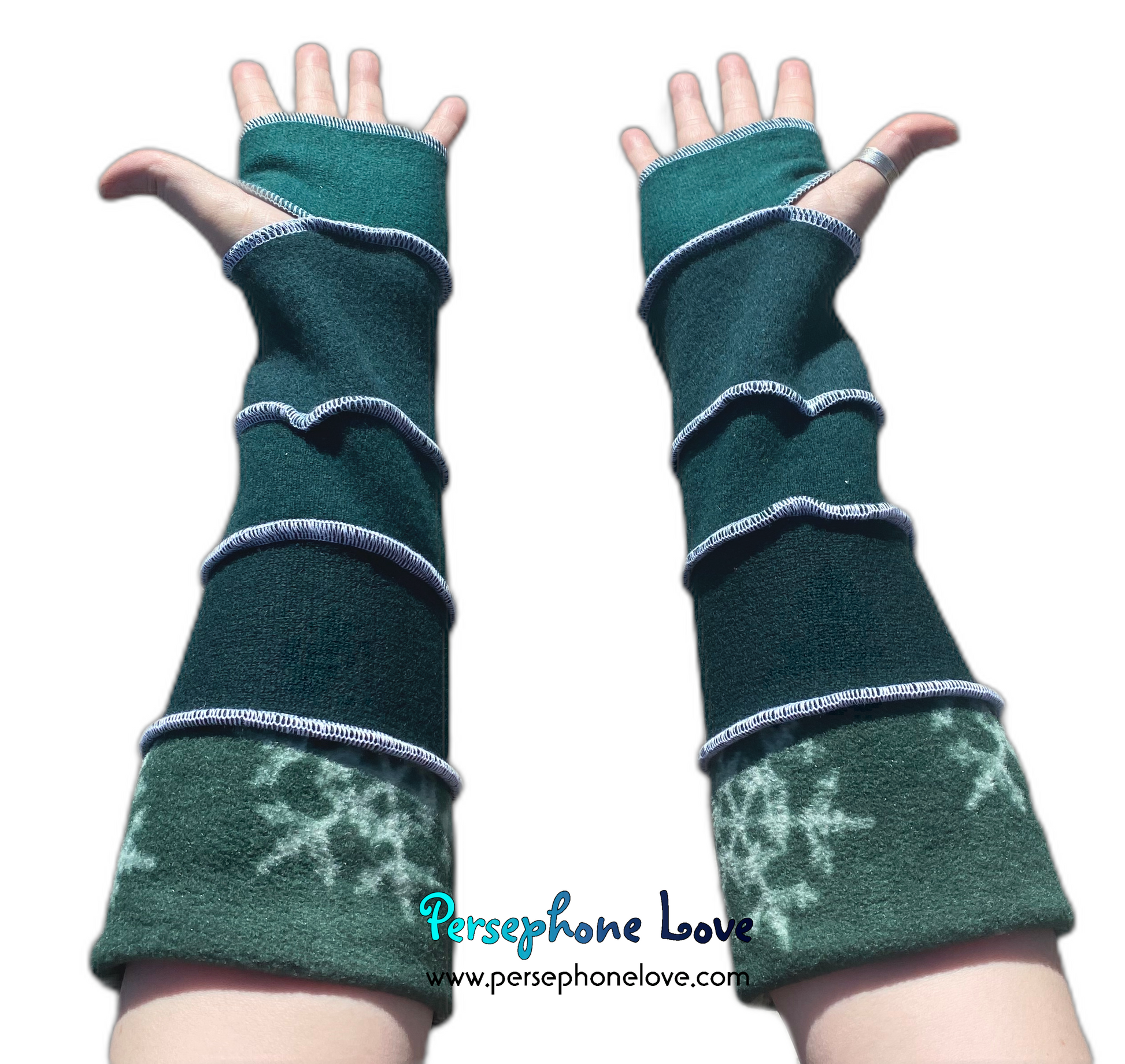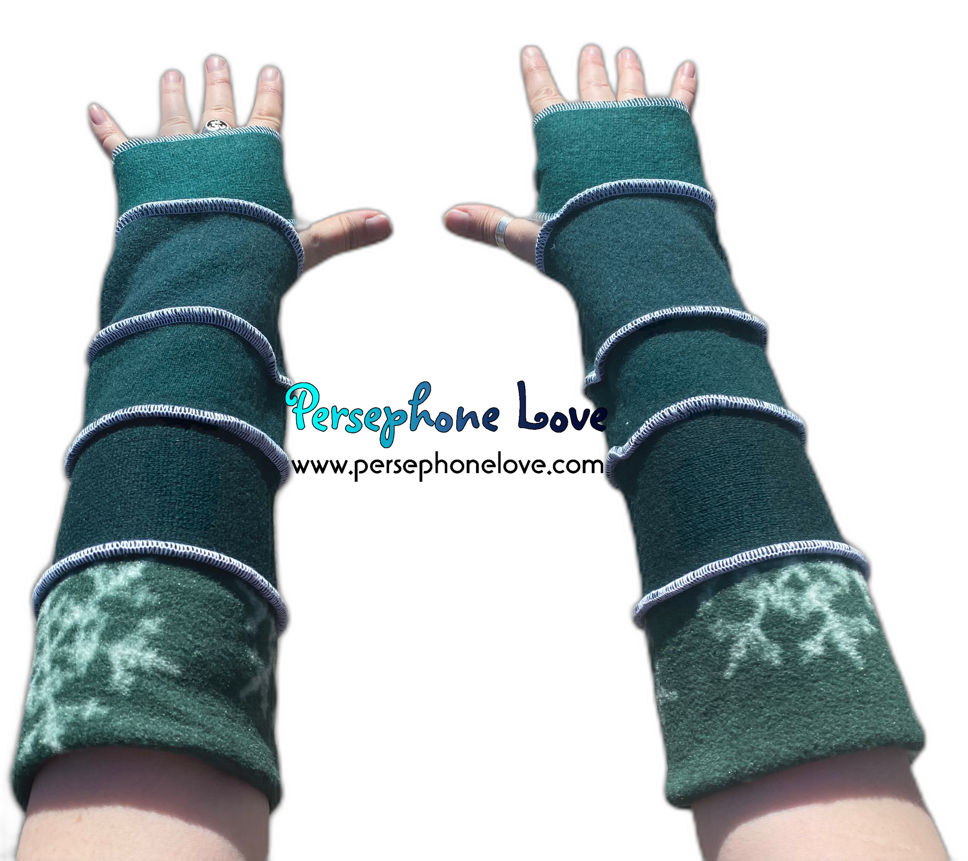 Needle-felted upcycled 100% cashmere arm warmers with thumb holes. The machine-needle-felting process makes these twice as thick and super warm. It also takes a lot longer to make these than other Katwise-style arm-warmers you may have seen, which is why they cost what they do (that plus cashmere is just a more expensive material and double-thickness is double-materials-cost). One size fits most and they are thick enough not to "droop" on you but still buttery soft and luxuriously comfortable. Sized generally for smaller adult bone structure but not intending to exclude anyone. I just want them to fit. They are impossible to perfectly measure, but I've done my best to give you some rough measurements to help out. đ