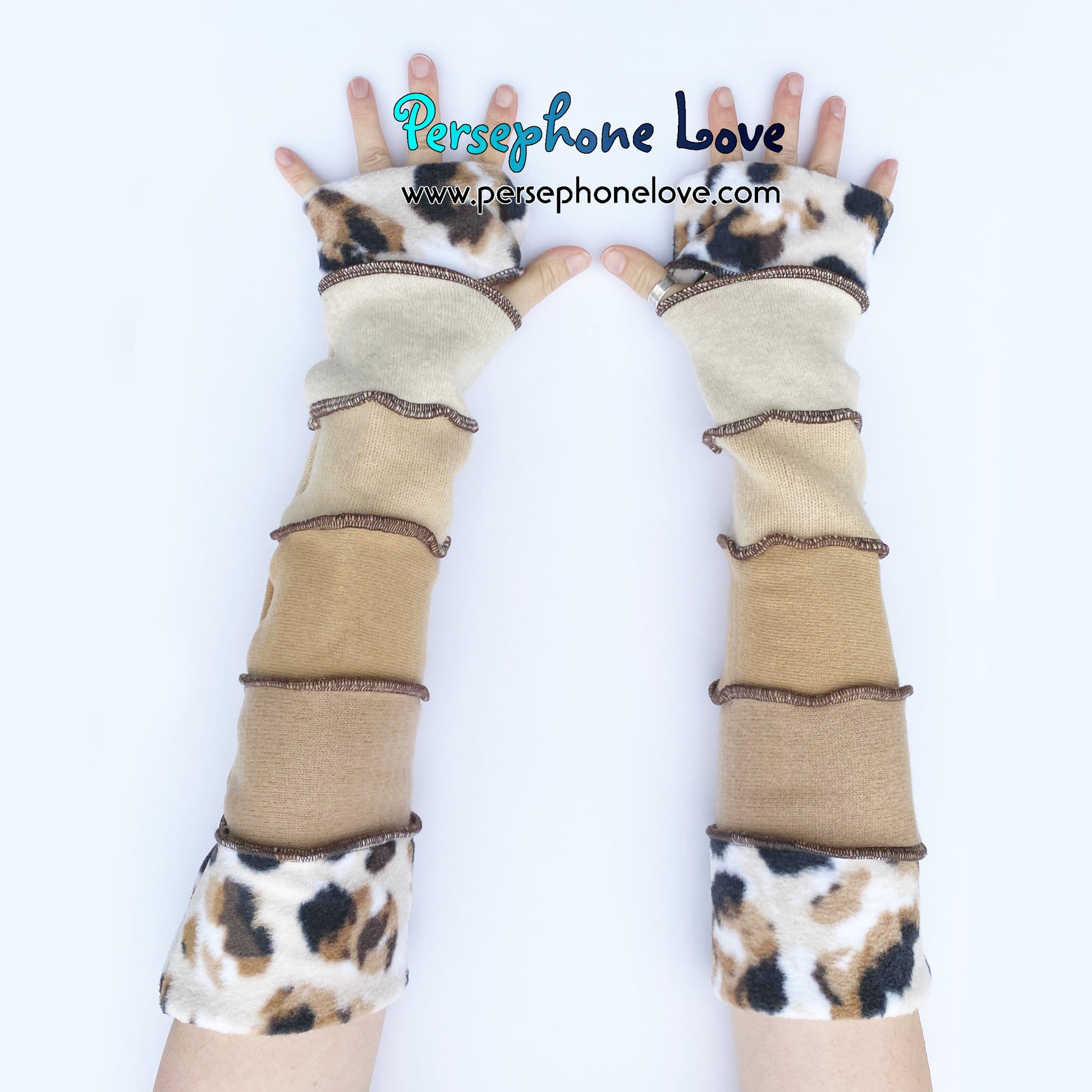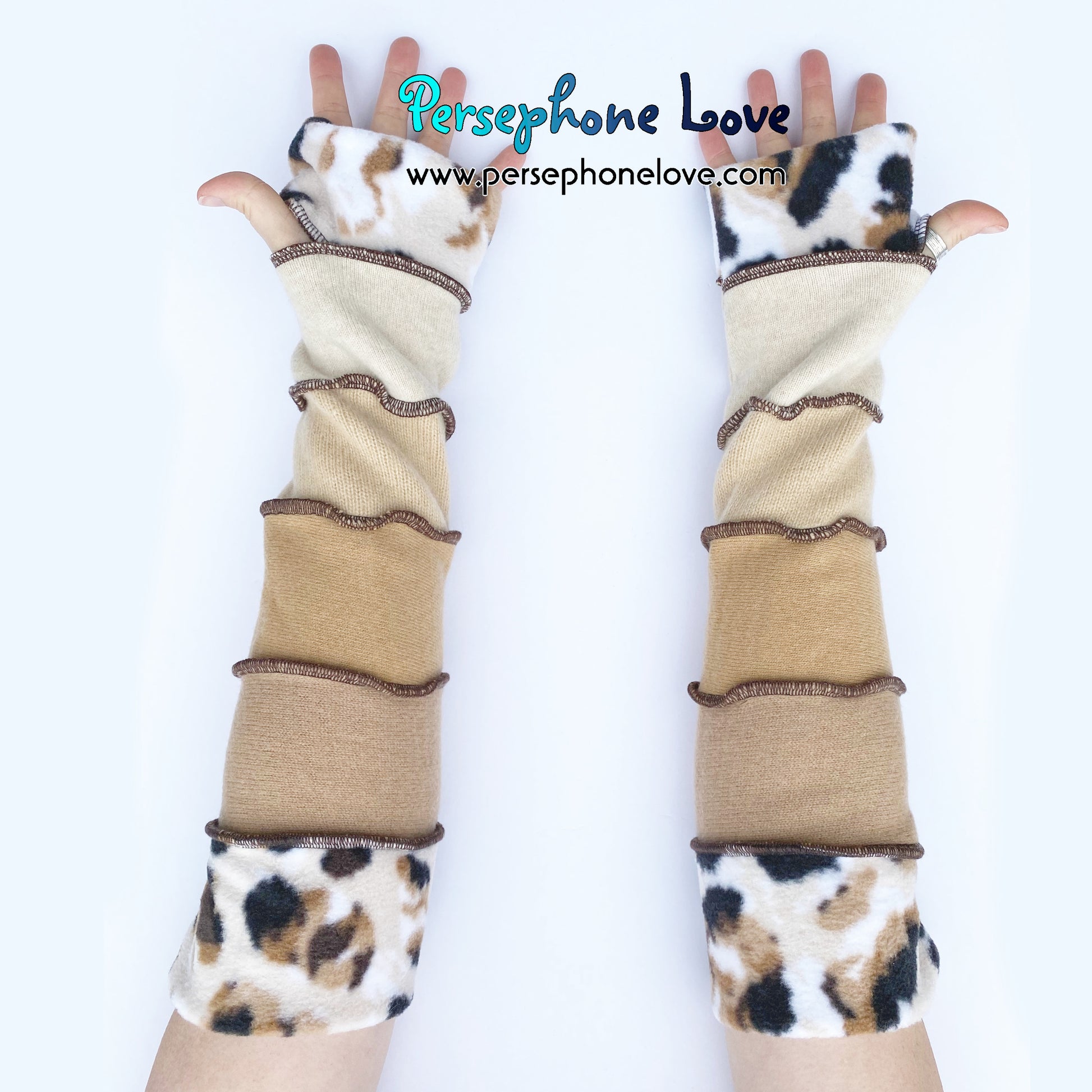 Needle-felted upcycled 100% cashmere arm warmers with thumb holes. The machine-needle-felting process makes these twice as thick and super warm. It also takes a lot longer to make these than other Katwise-style arm-warmers you may have seen, which is why they cost what they do (that plus cashmere is just a more expensive material and double-thickness is double-materials-cost). One size fits most and they are thick enough not to "droop" on you but still buttery soft and luxuriously comfortable. Sized generally for smaller adult bone structure but not intending to exclude anyone. I just want them to fit. They are impossible to perfectly measure, but I've done my best to give you some rough measurements to help out. đÂ