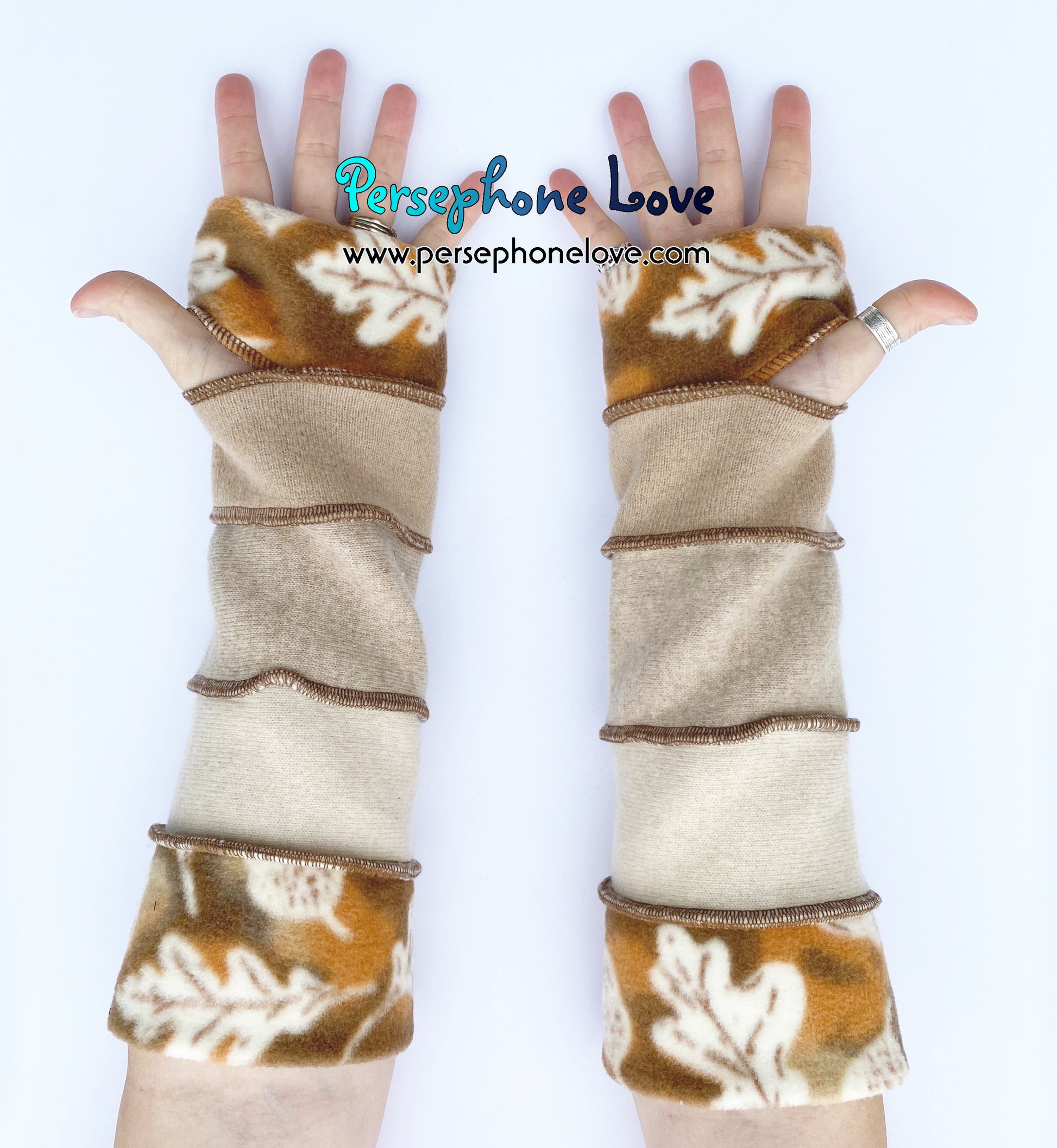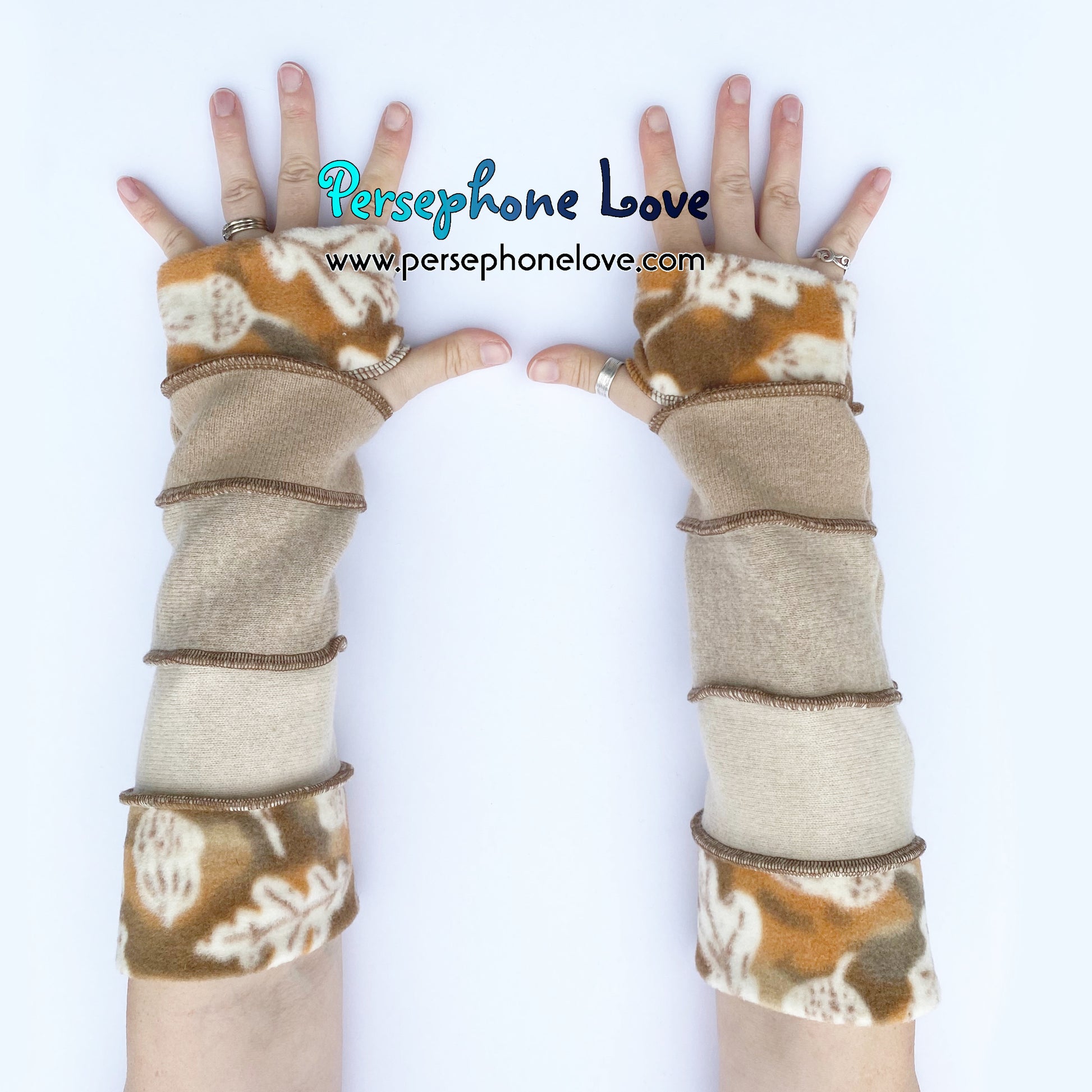 Needle-felted upcycled 100% cashmere arm warmers with thumb holes. The machine-needle-felting process makes these twice as thick and super warm. It also takes a lot longer to make these than other Katwise-style arm-warmers you may have seen, which is why they cost what they do (that plus cashmere is just a more expensive material and double-thickness is double-materials-cost). One size fits most and they are thick enough not to "droop" on you but still buttery soft and luxuriously comfortable. Sized generally for smaller adult bone structure but not intending to exclude anyone. I just want them to fit. They are impossible to perfectly measure, but I've done my best to give you some rough measurements to help out. đÂ