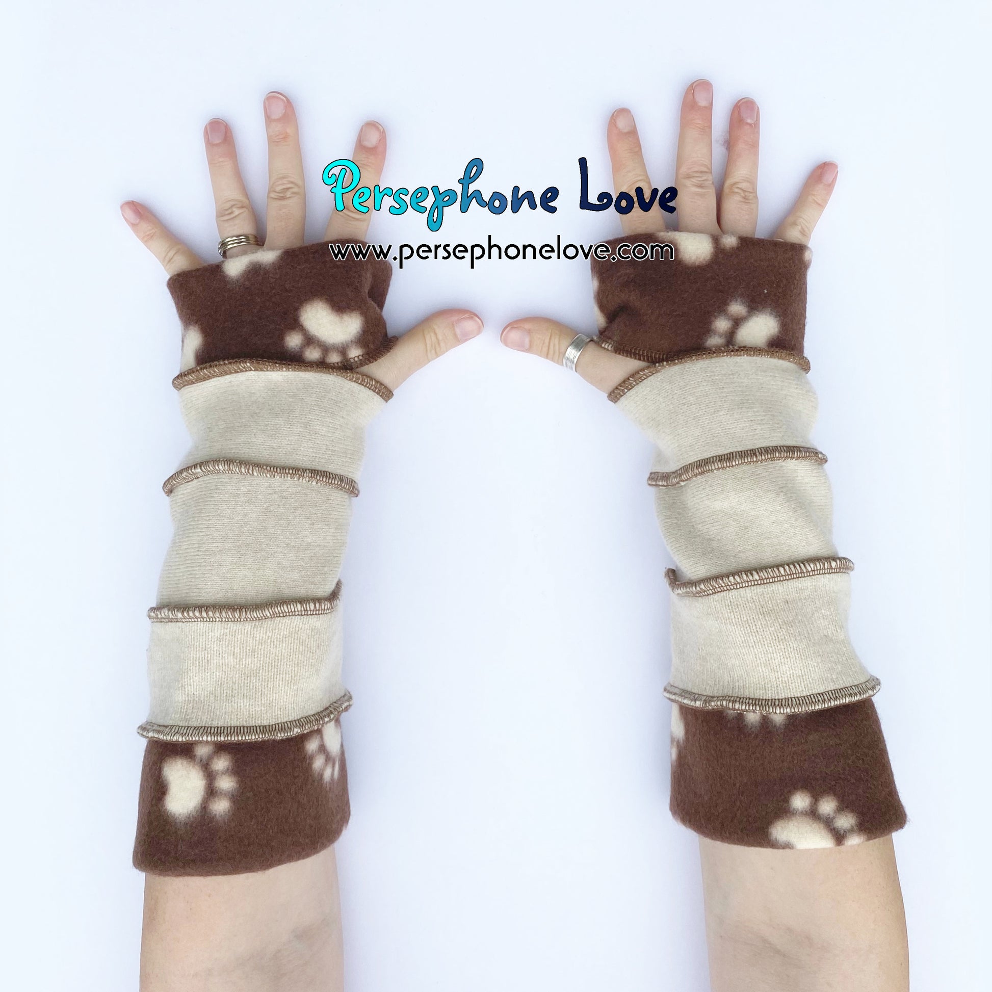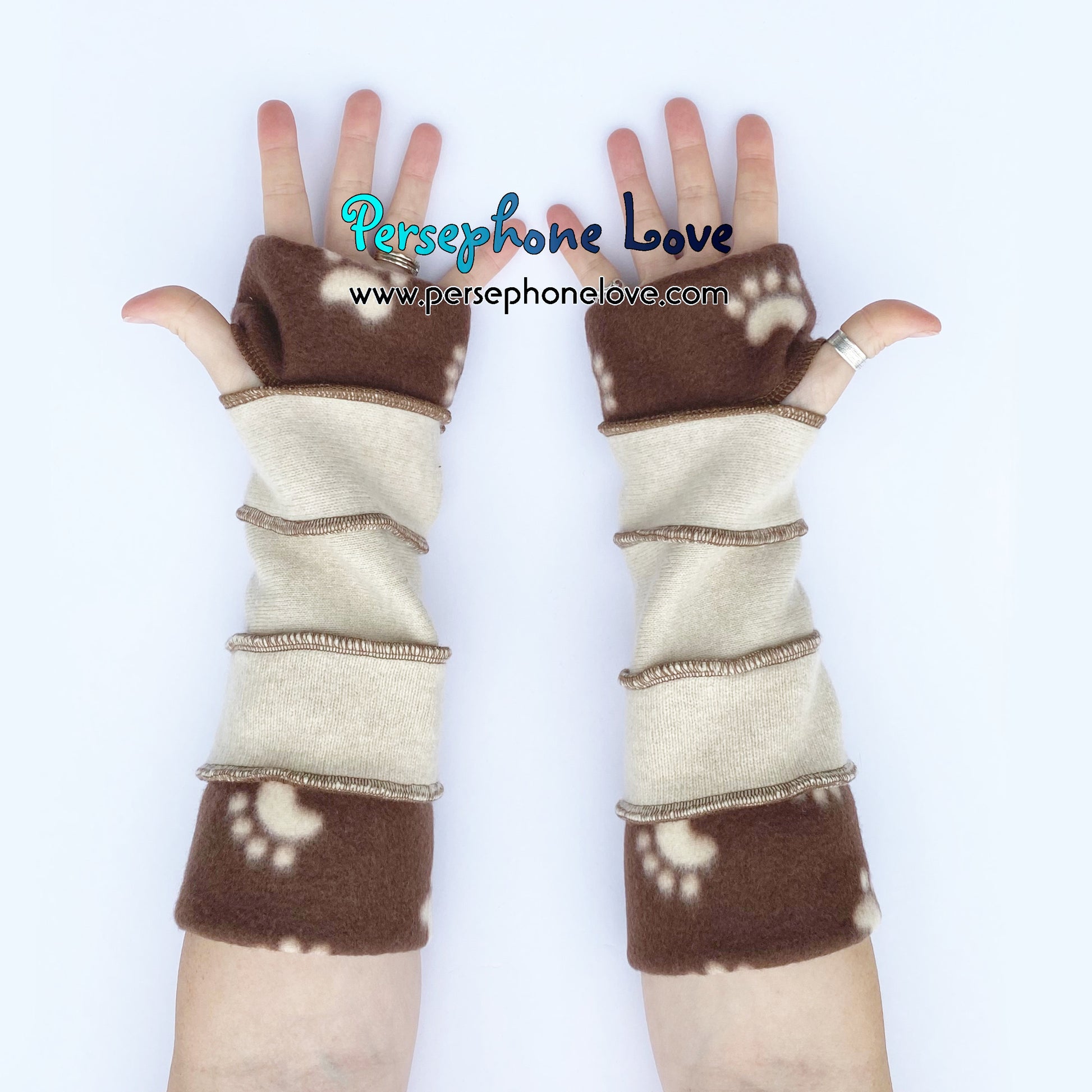 Needle-felted upcycled 100% cashmere arm warmers with thumb holes. The machine-needle-felting process makes these twice as thick and super warm. It also takes a lot longer to make these than other Katwise-style arm-warmers you may have seen, which is why they cost what they do (that plus cashmere is just a more expensive material and double-thickness is double-materials-cost). One size fits most and they are thick enough not to "droop" on you but still buttery soft and luxuriously comfortable. Sized generally for smaller adult bone structure but not intending to exclude anyone. I just want them to fit. They are impossible to perfectly measure, but I've done my best to give you some rough measurements to help out. đÂ