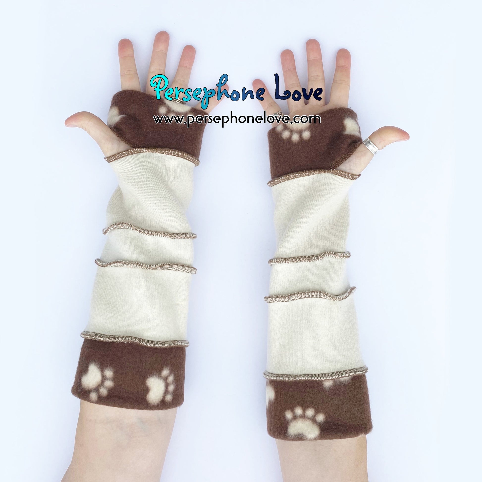 Needle-felted upcycled 100% cashmere arm warmers with thumb holes. The machine-needle-felting process makes these twice as thick and super warm. It also takes a lot longer to make these than other Katwise-style arm-warmers you may have seen, which is why they cost what they do (that plus cashmere is just a more expensive material and double-thickness is double-materials-cost). One size fits most and they are thick enough not to "droop" on you but still buttery soft and luxuriously comfortable. Sized generally for smaller adult bone structure but not intending to exclude anyone. I just want them to fit. They are impossible to perfectly measure, but I've done my best to give you some rough measurements to help out. đÂ