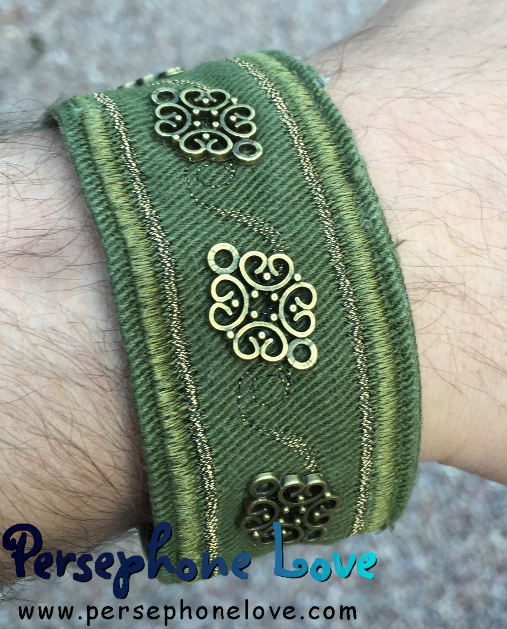 Olive green antique gold embroidered Celtic knot upcycled denim bracelet-1154