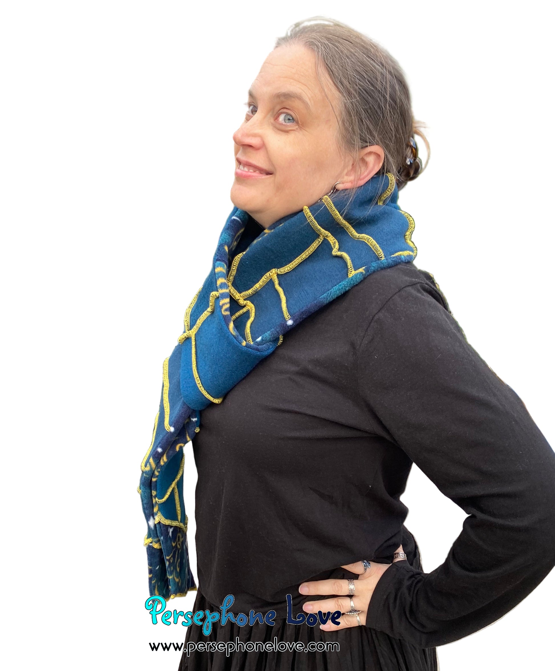 Patchwork teal 100% cashmere upcycled needle-felted sweater scarf -1832
