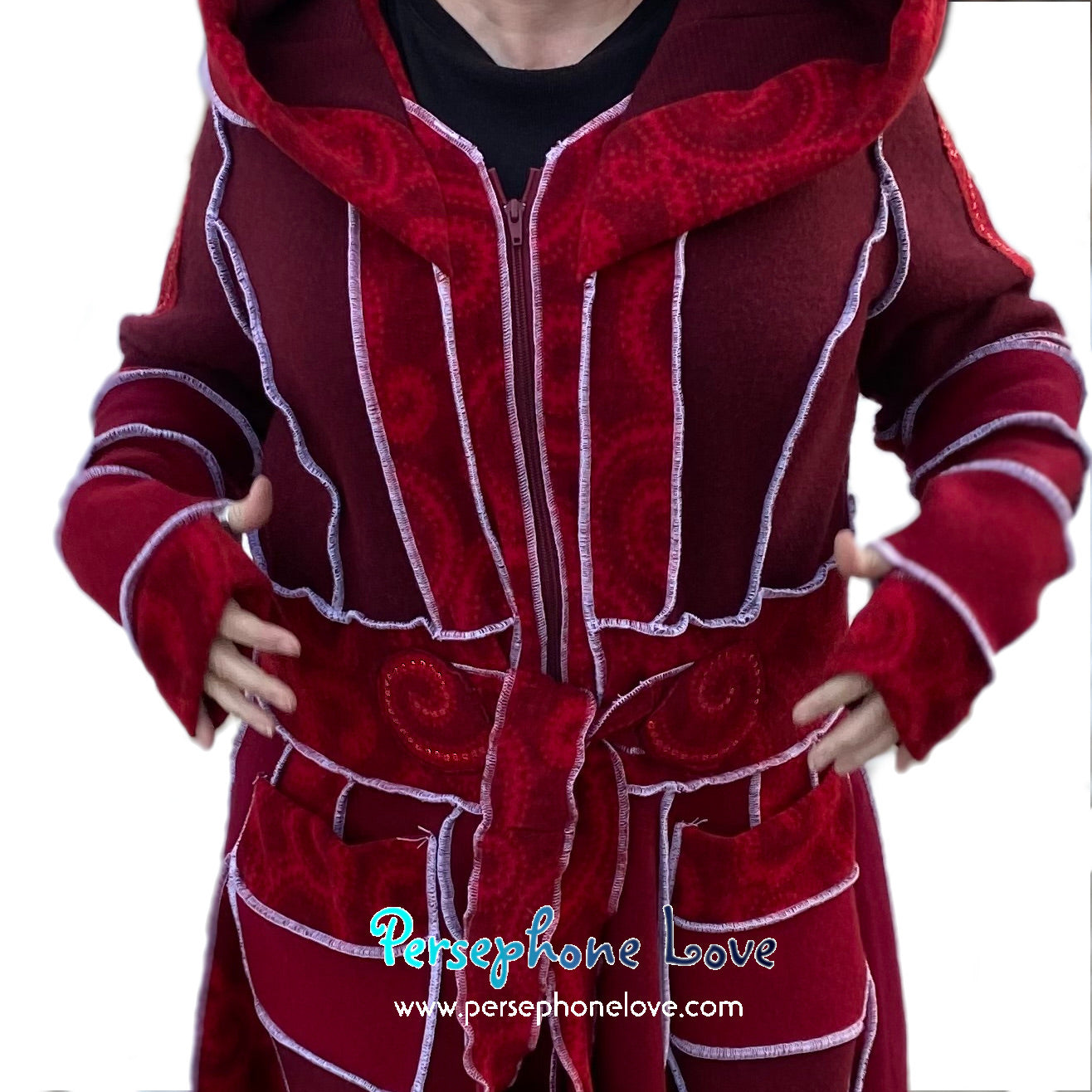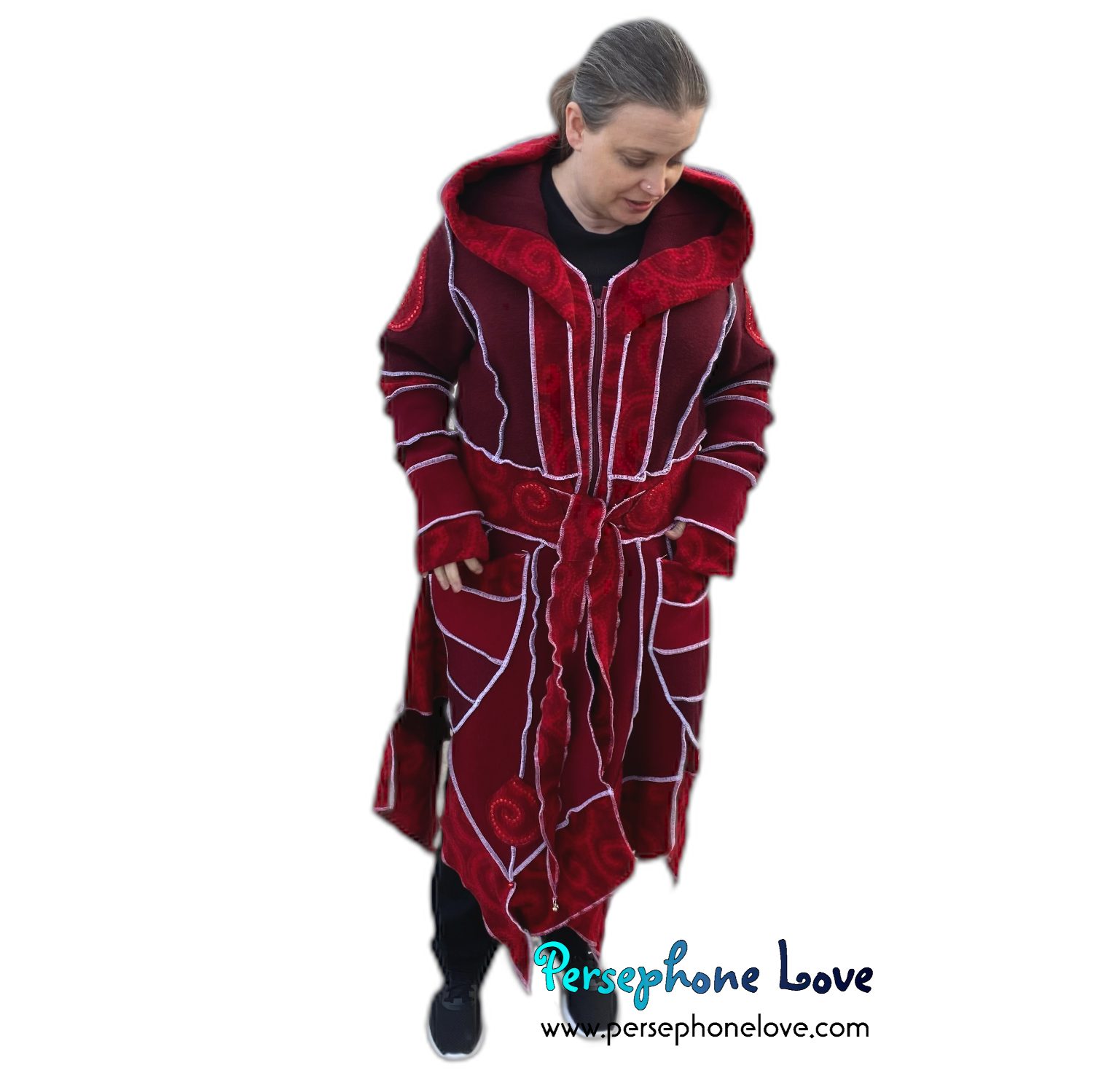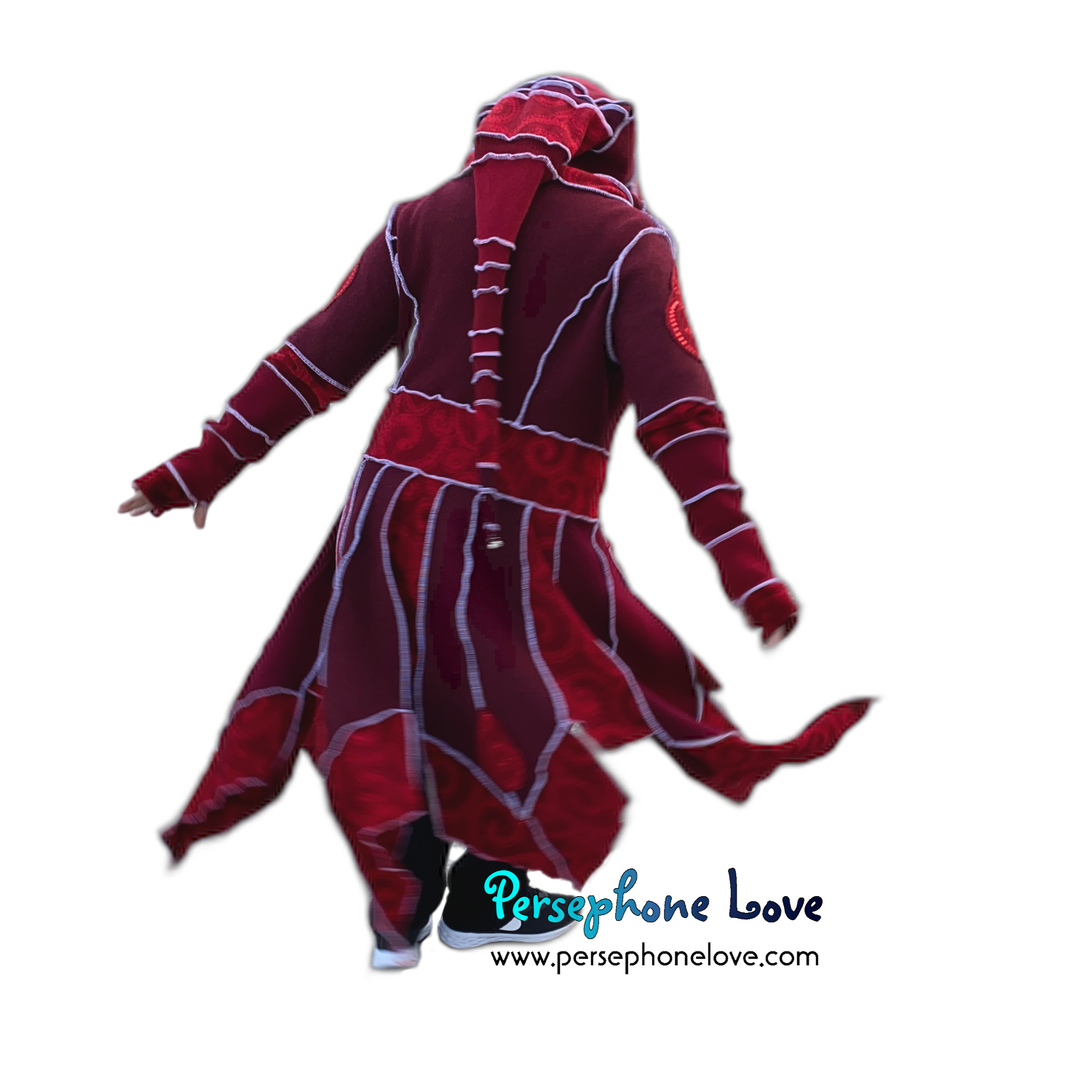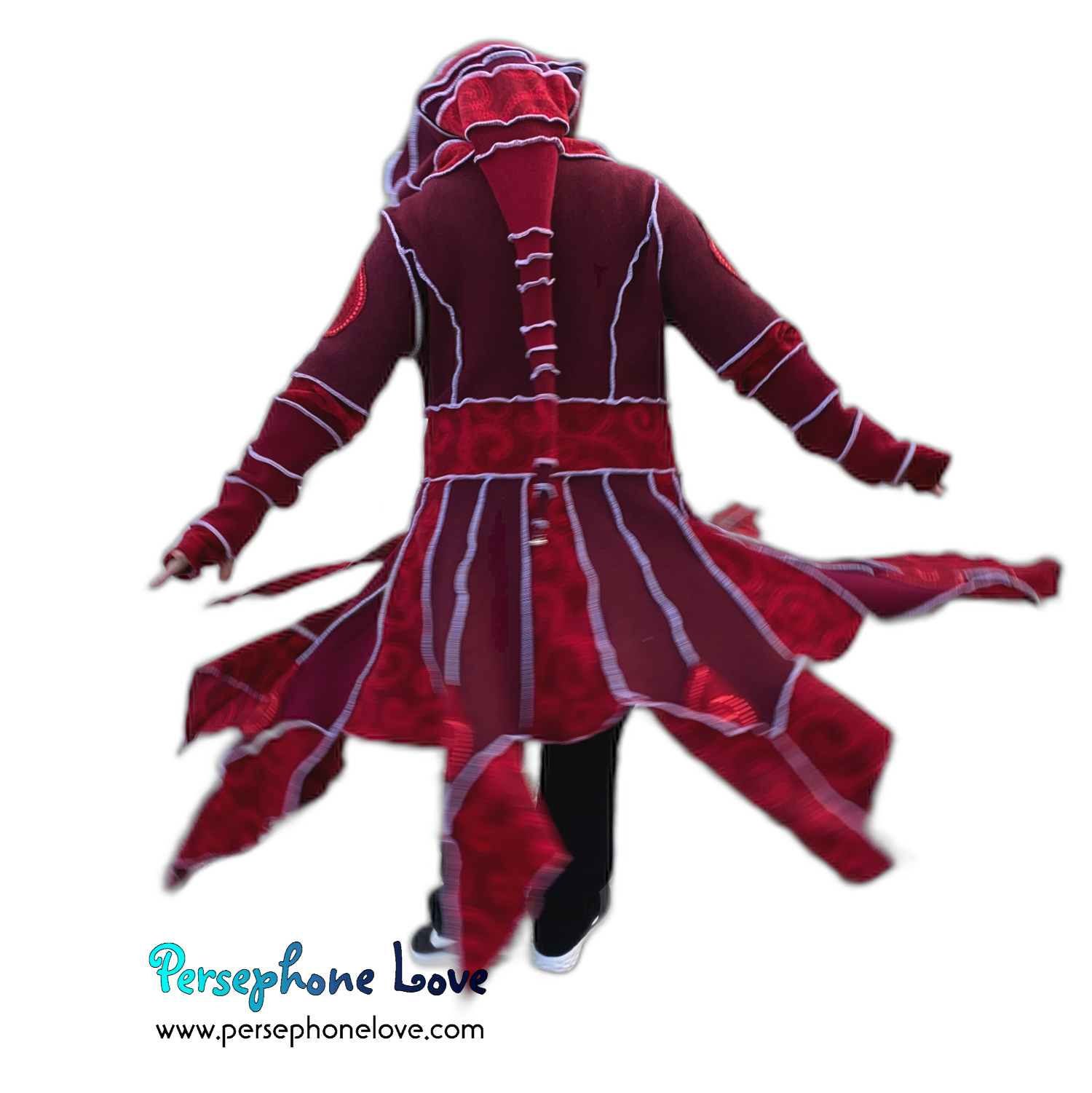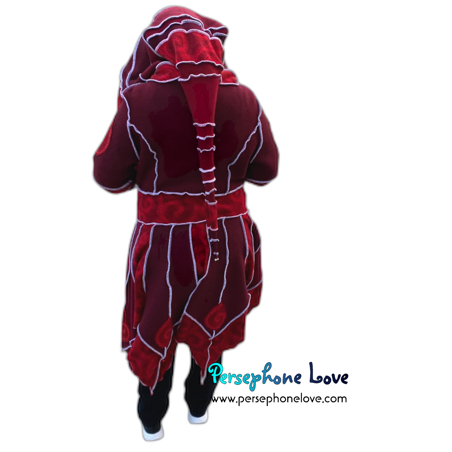 This one is part of my newer "pixie bottom" coat designs - even the "skirt" section is felted for supreme durability. Also hidden inside the hood brim are 4 felted layers.. so instead of 2-ply cashmere, think 8-ply... which I felted the heck out of to super-compress them, so the hood brim has a lot more structure than my earlier works, but without adding too much bulk. The result is a hood that has a better "hang" and holds a shape better when worn up over the head. This one also has a ton of extra bells attached to the pixie points so it looks like a coat but doubles as a musical instrument. (If you want to sneak up on people silently you can always remove them but I frankly think they make for an awesome coat.)🎵