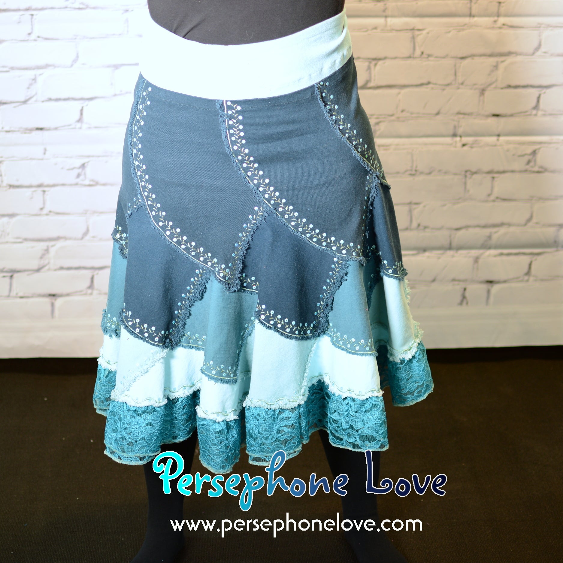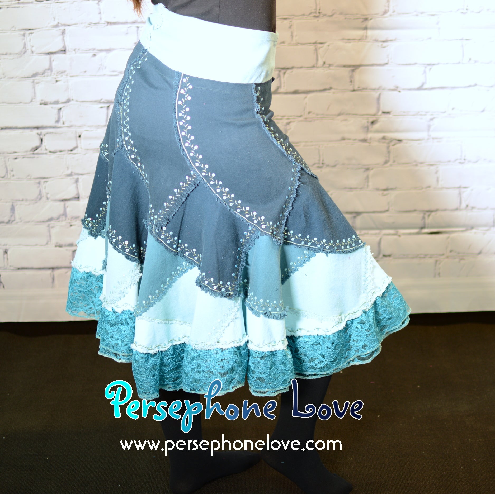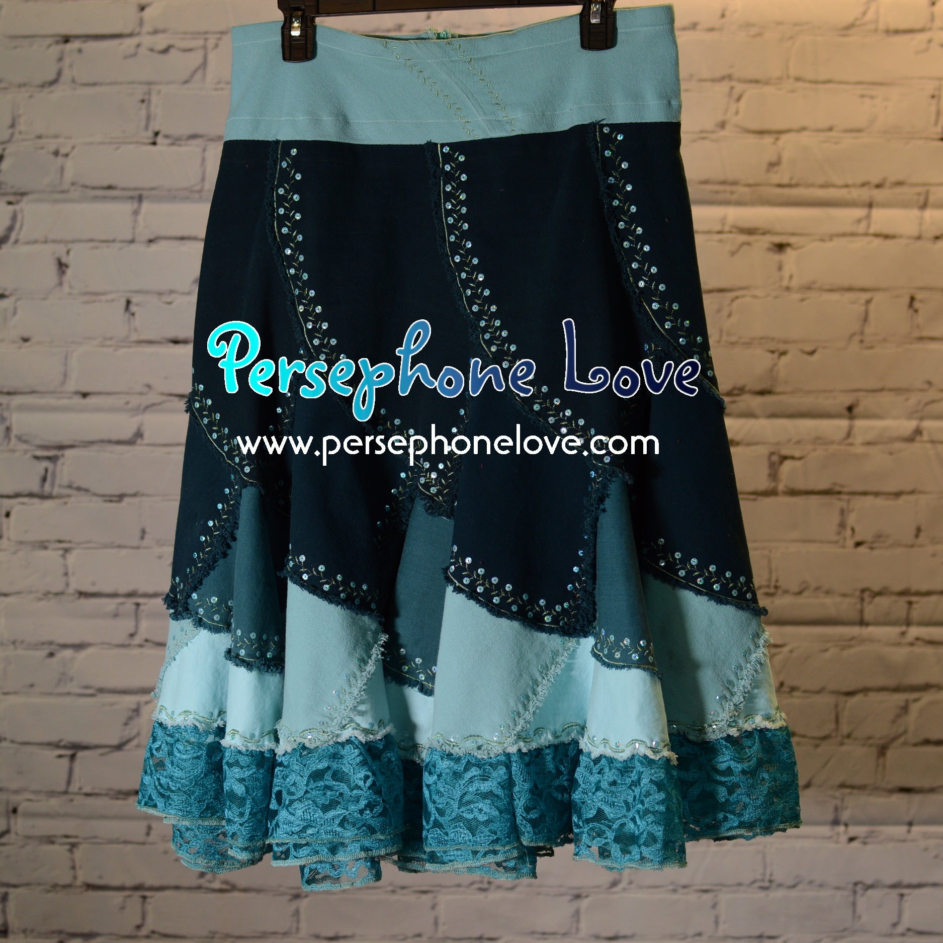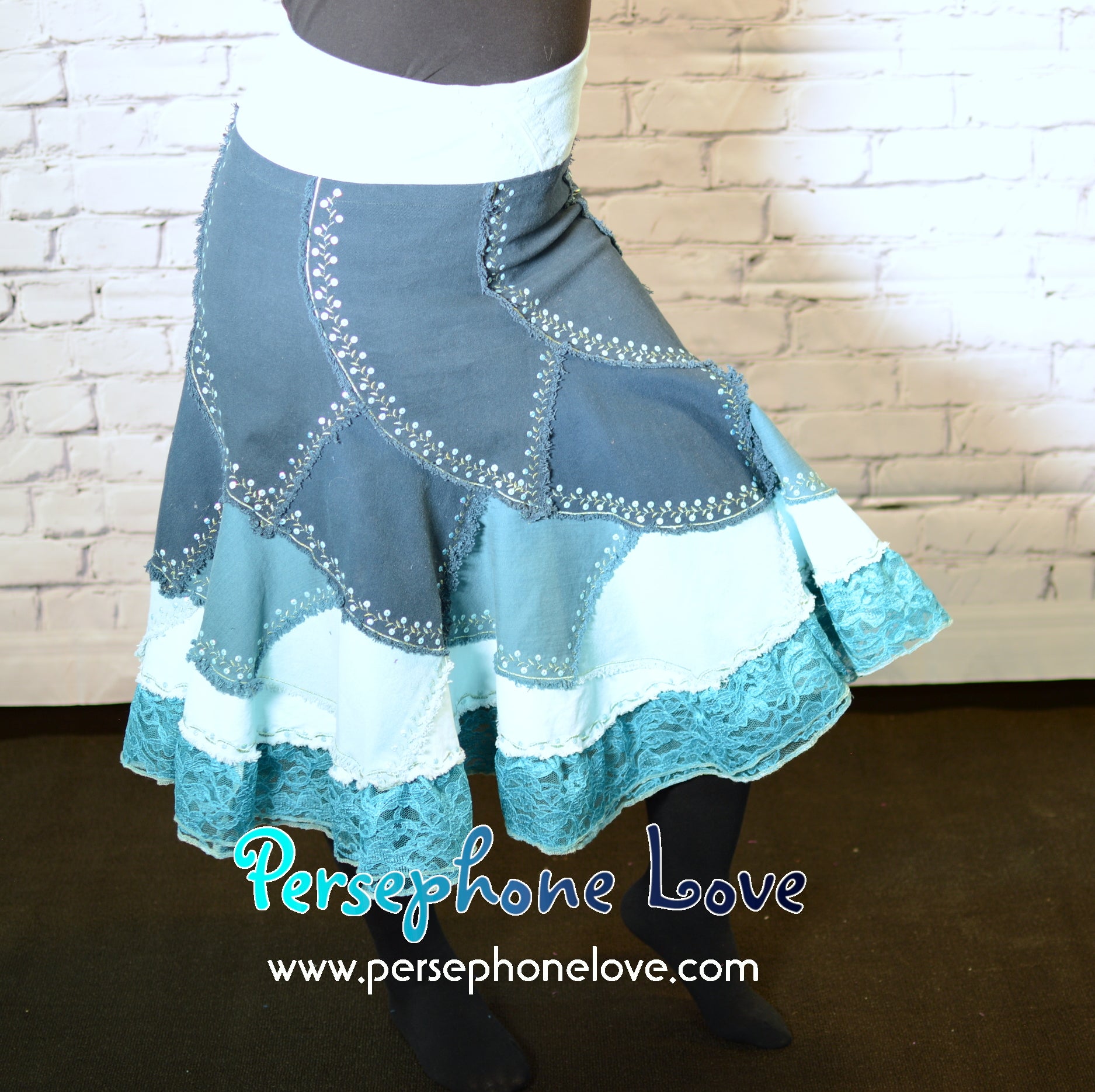 Turquoise ombre patchwork denim upcycled twirly spiral festival skirt embroidery sequins-2004
