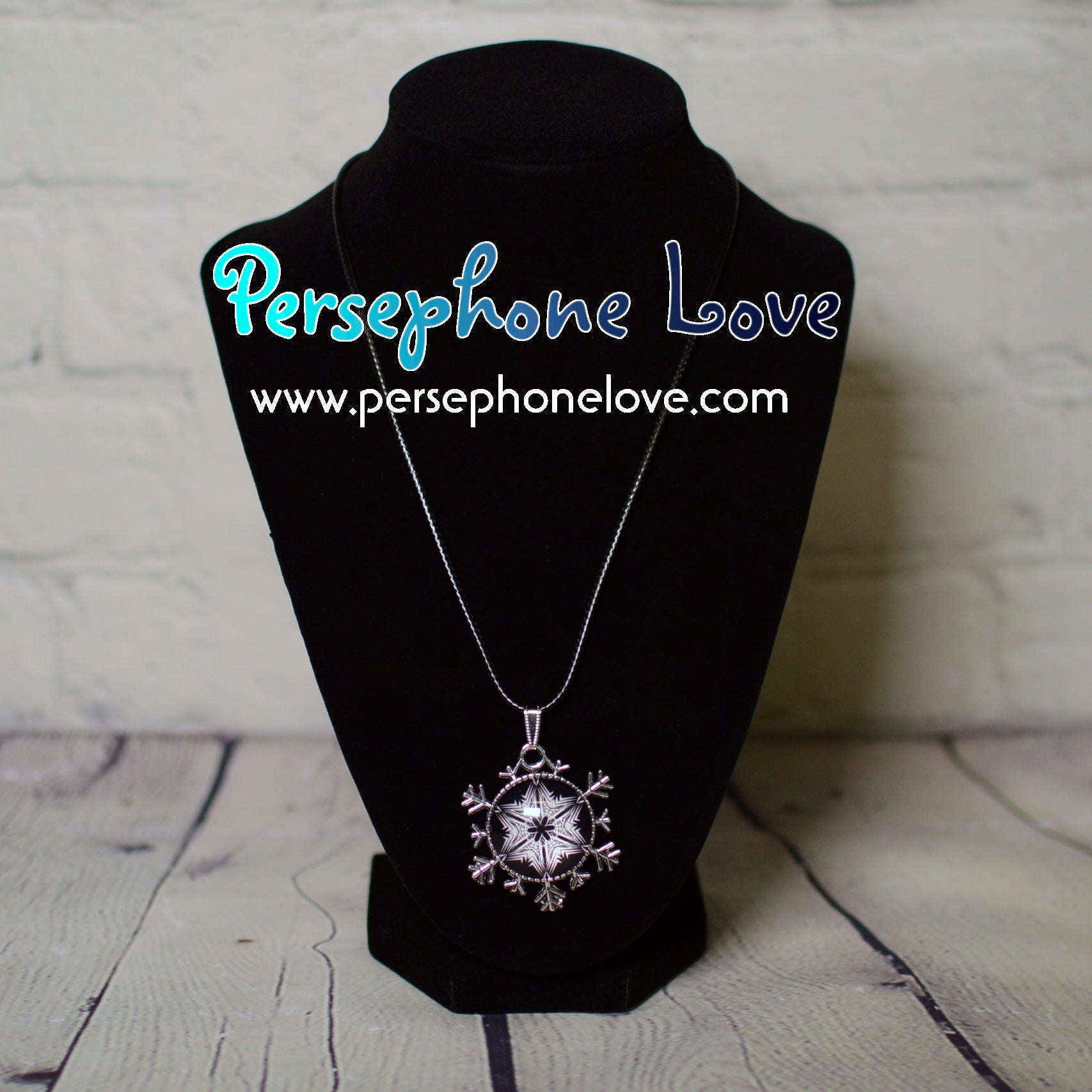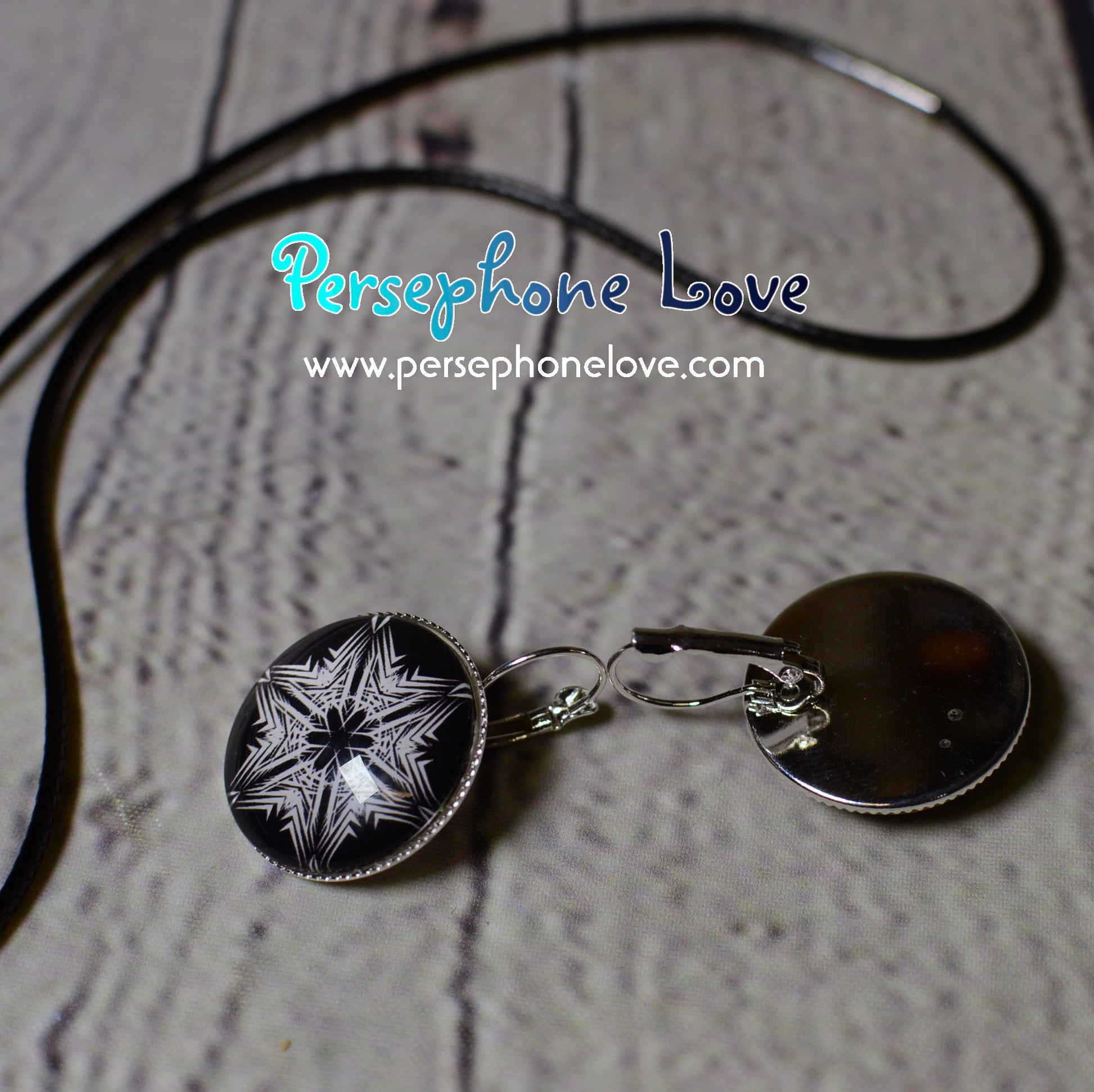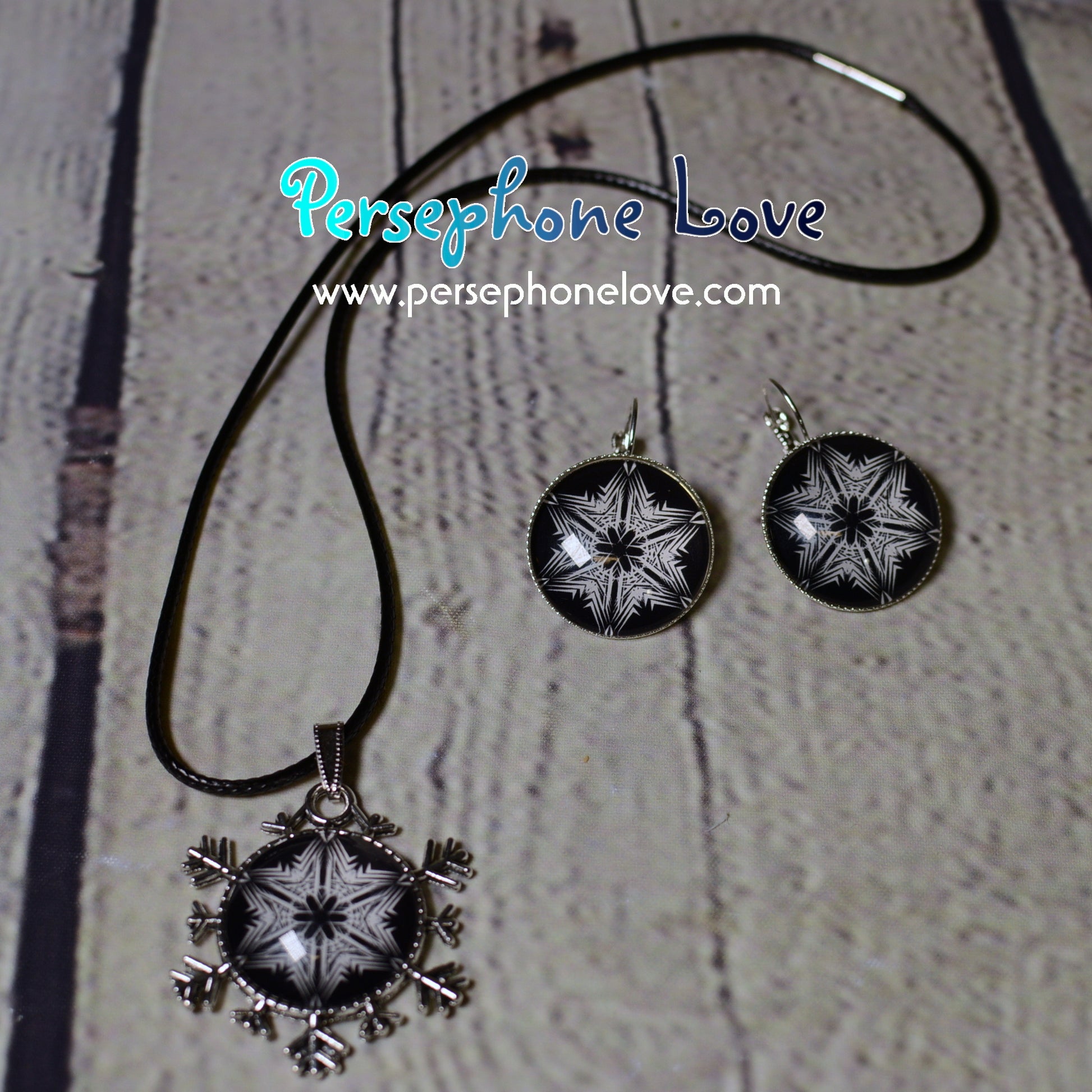 Just in time for the holidays. Necklace and earring set with 20 mm glass cabochons in a lovely holiday pattern. Earrings are french "leverback" style in stainless steel. Pendant made from nickel-free metal alloy in a cute snowflake pattern. Necklace cord is a vegan-friendly waxed cord with a sturdy male-female pin fastener. Measures approximately ~17.9 inches.