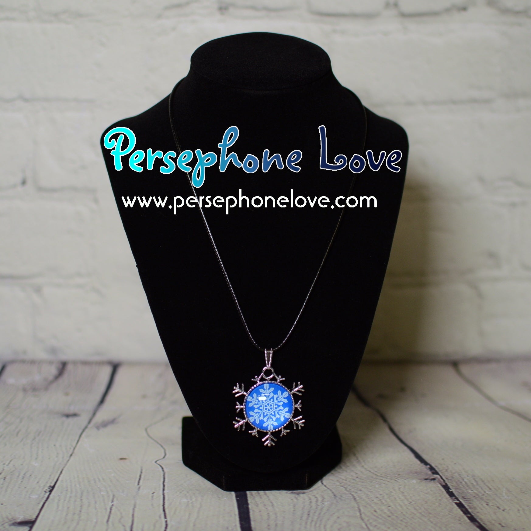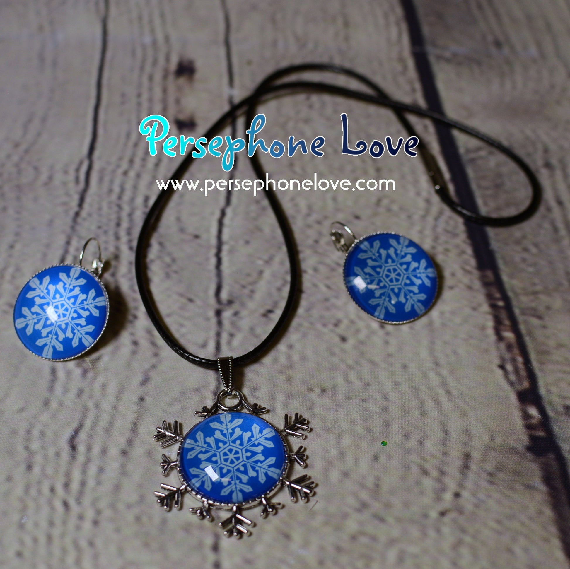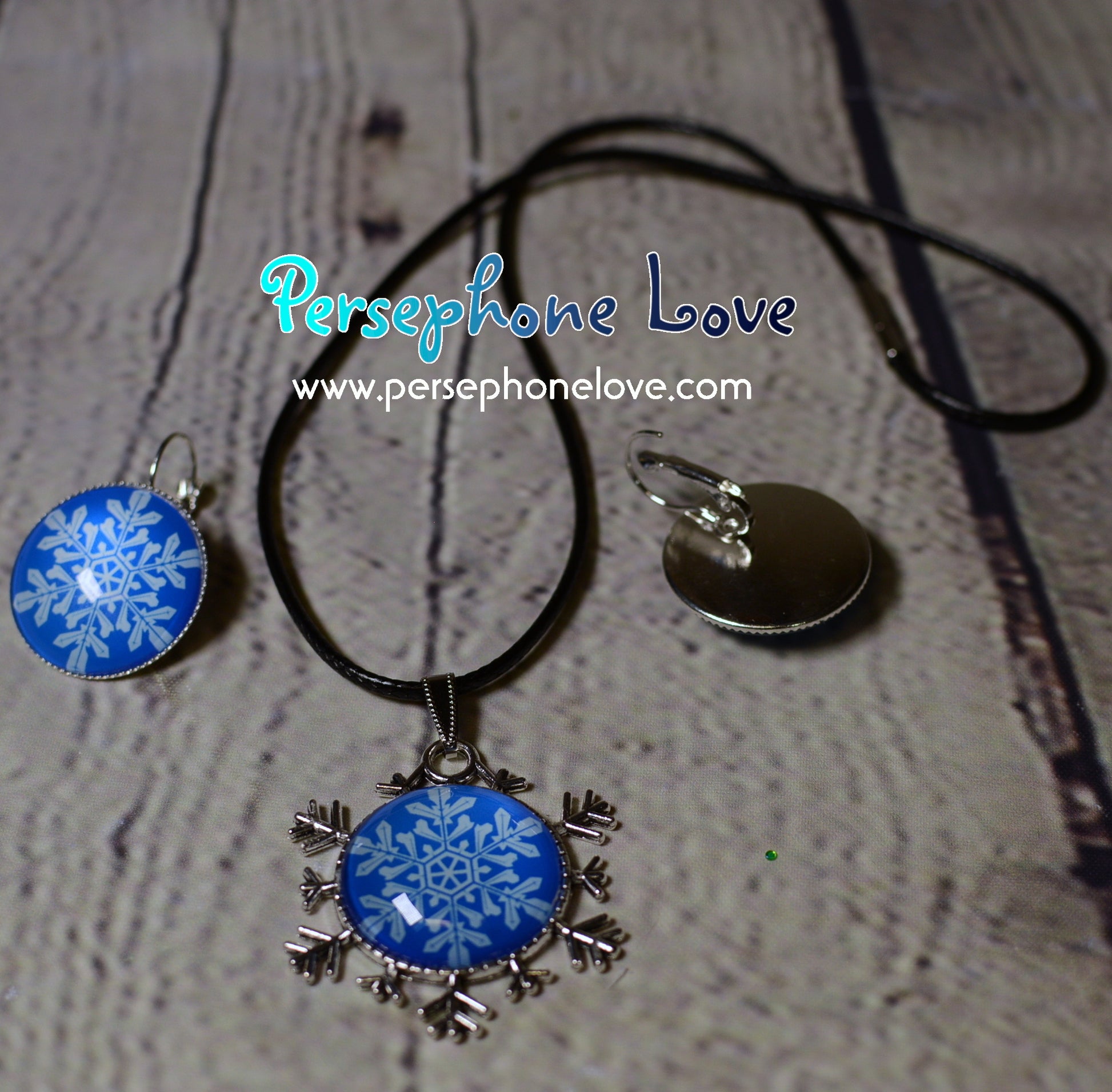 Just in time for the holidays. Necklace and earring set with 20 mm glass cabochons in a lovely holiday pattern. Earrings are french "leverback" style in stainless steel. Pendant made from nickel-free metal alloy in a cute snowflake pattern. Necklace cord is a vegan-friendly waxed cord with a sturdy male-female pin fastener. Measures approximately ~17.9 inches.