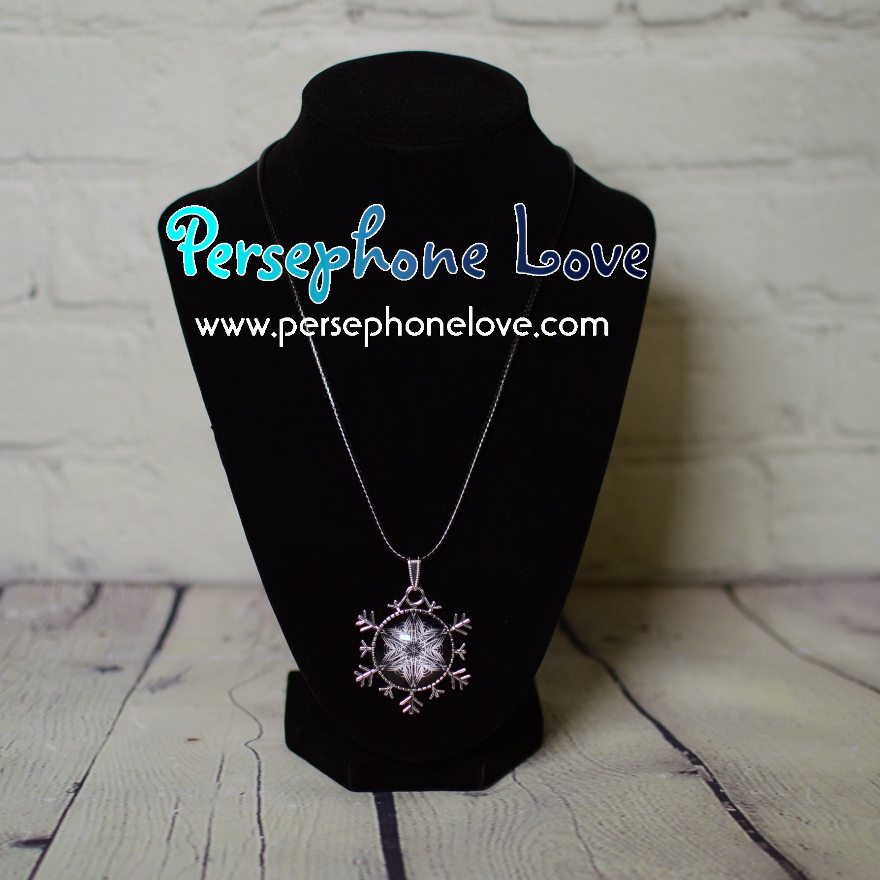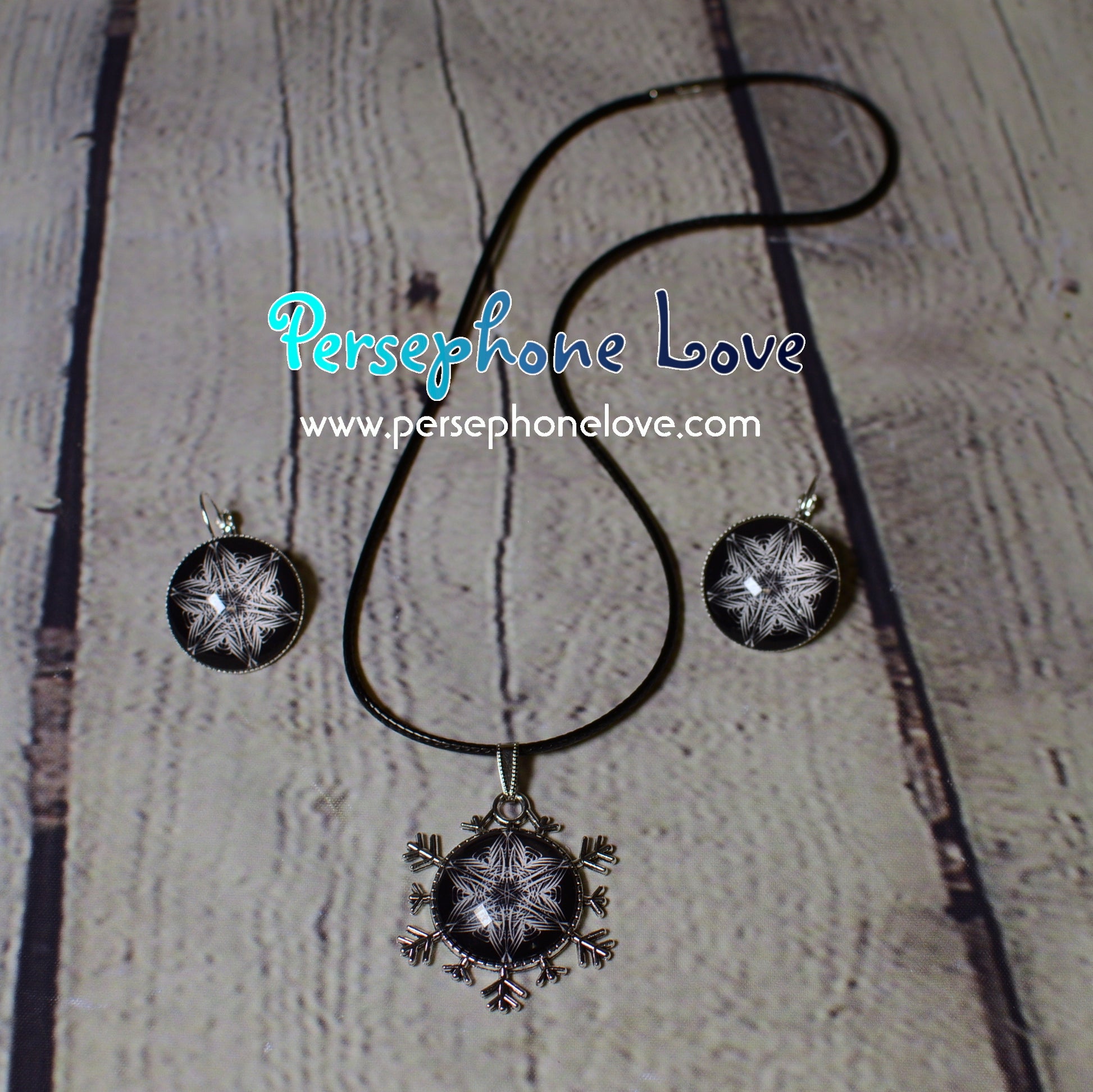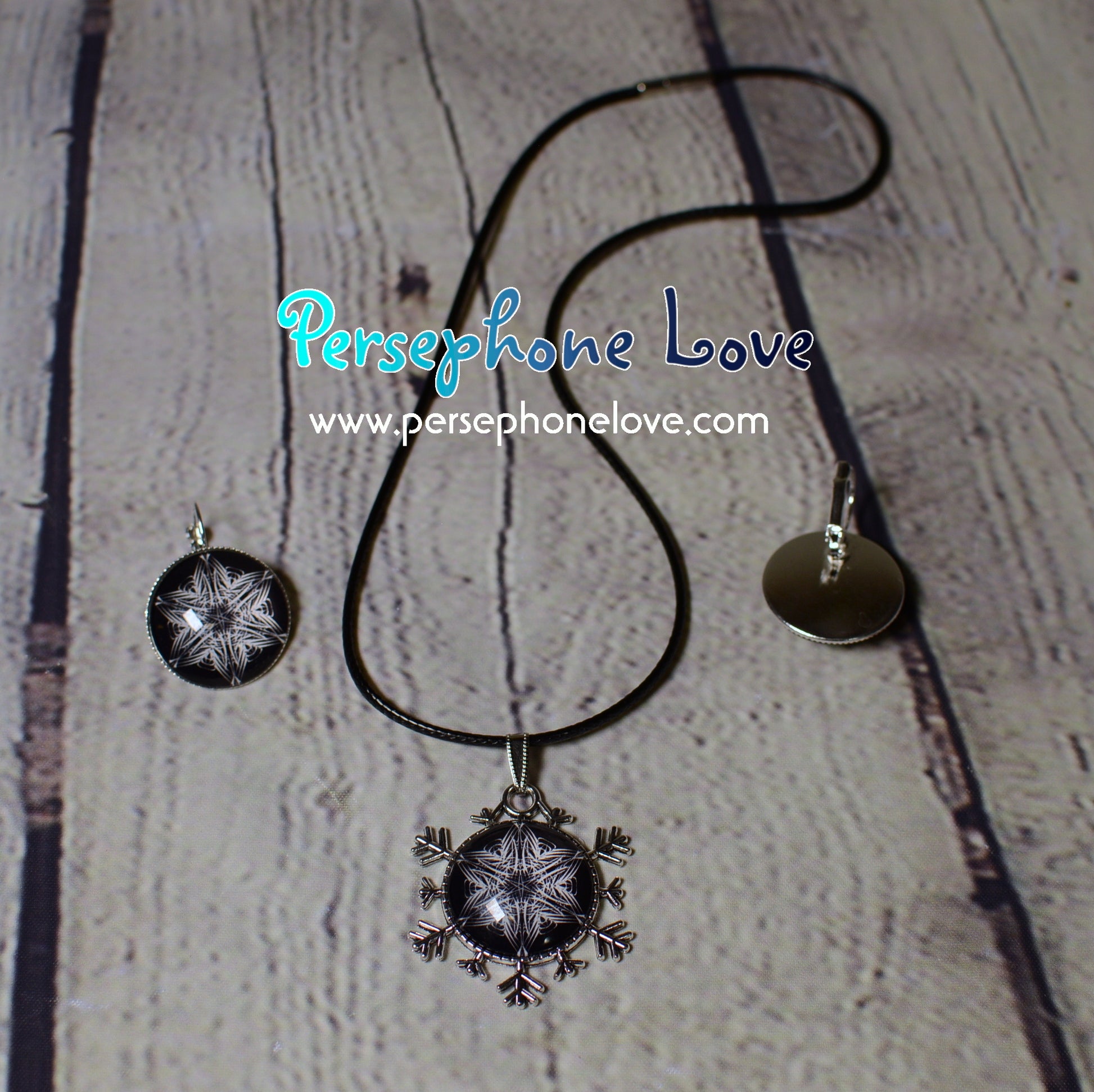 Just in time for the holidays. Necklace and earring set with 20 mm glass cabochons in a lovely holiday pattern. Earrings are french "leverback" style in stainless steel. Pendant made from nickel-free metal alloy in a cute snowflake pattern. Necklace cord is a vegan-friendly waxed cord with a sturdy male-female pin fastener. Measures approximately ~17.9 inches.