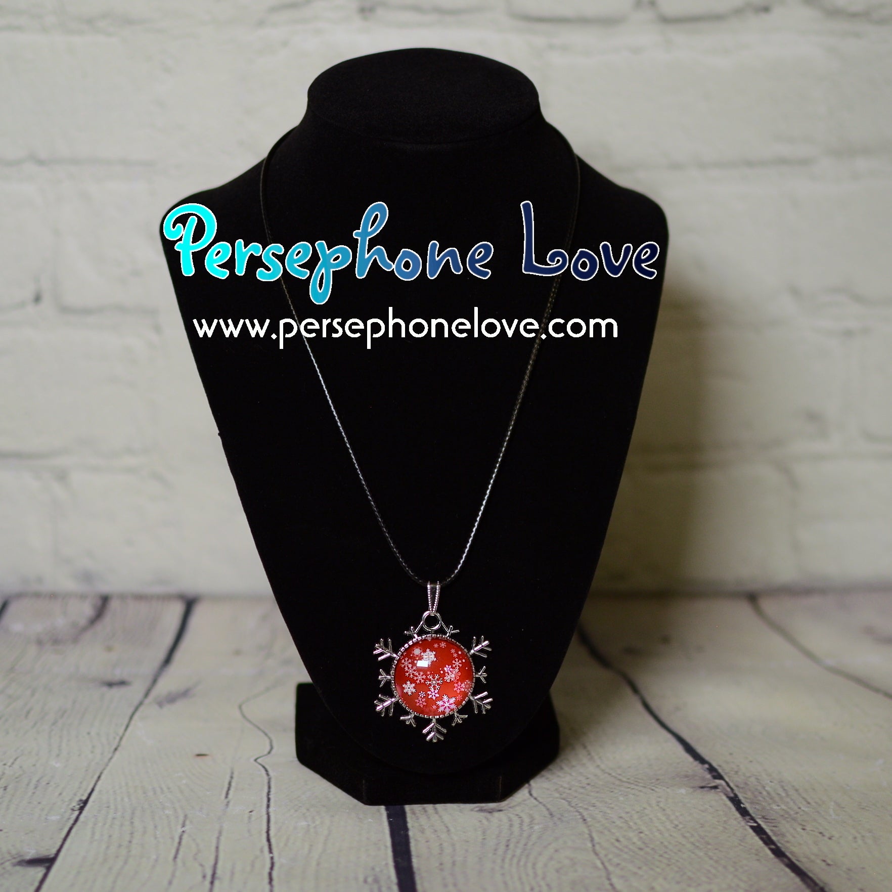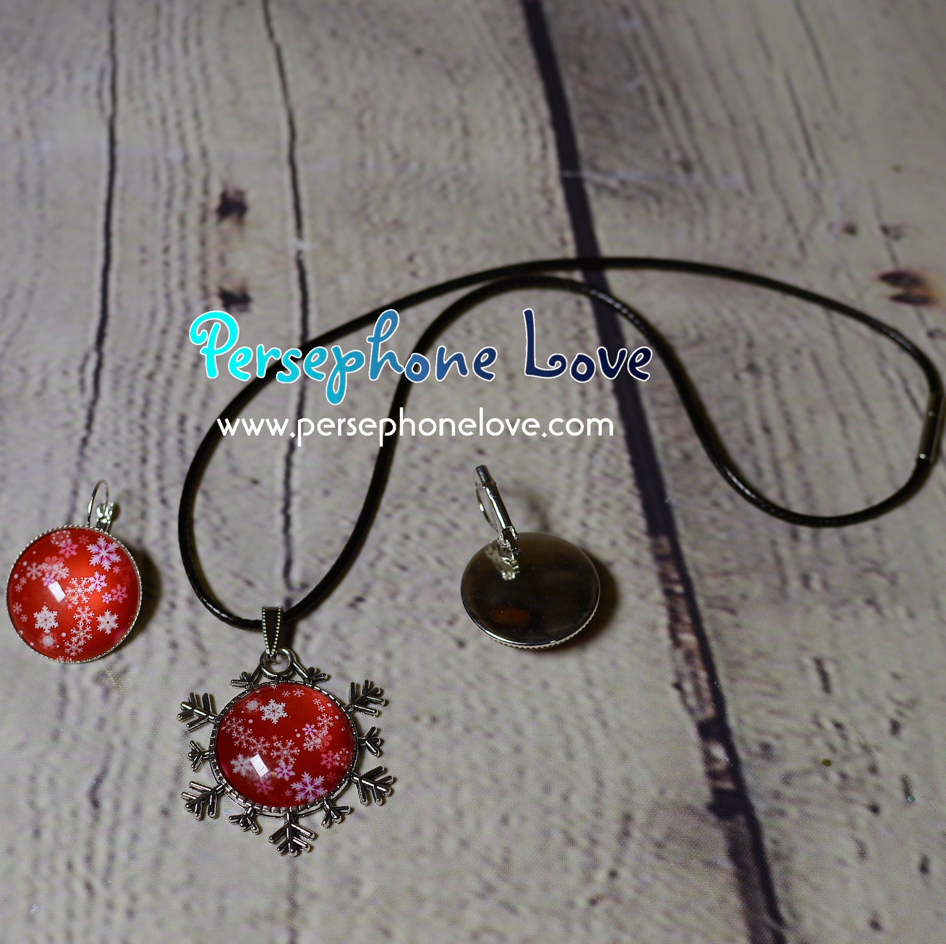 Just in time for the holidays. Necklace and earring set with 20 mm glass cabochons in a lovely holiday pattern. Earrings are french "leverback" style in stainless steel. Pendant made from nickel-free metal alloy in a cute snowflake pattern. Necklace cord is a vegan-friendly waxed cord with a sturdy male-female pin fastener. Measures approximately ~17.9 inches.